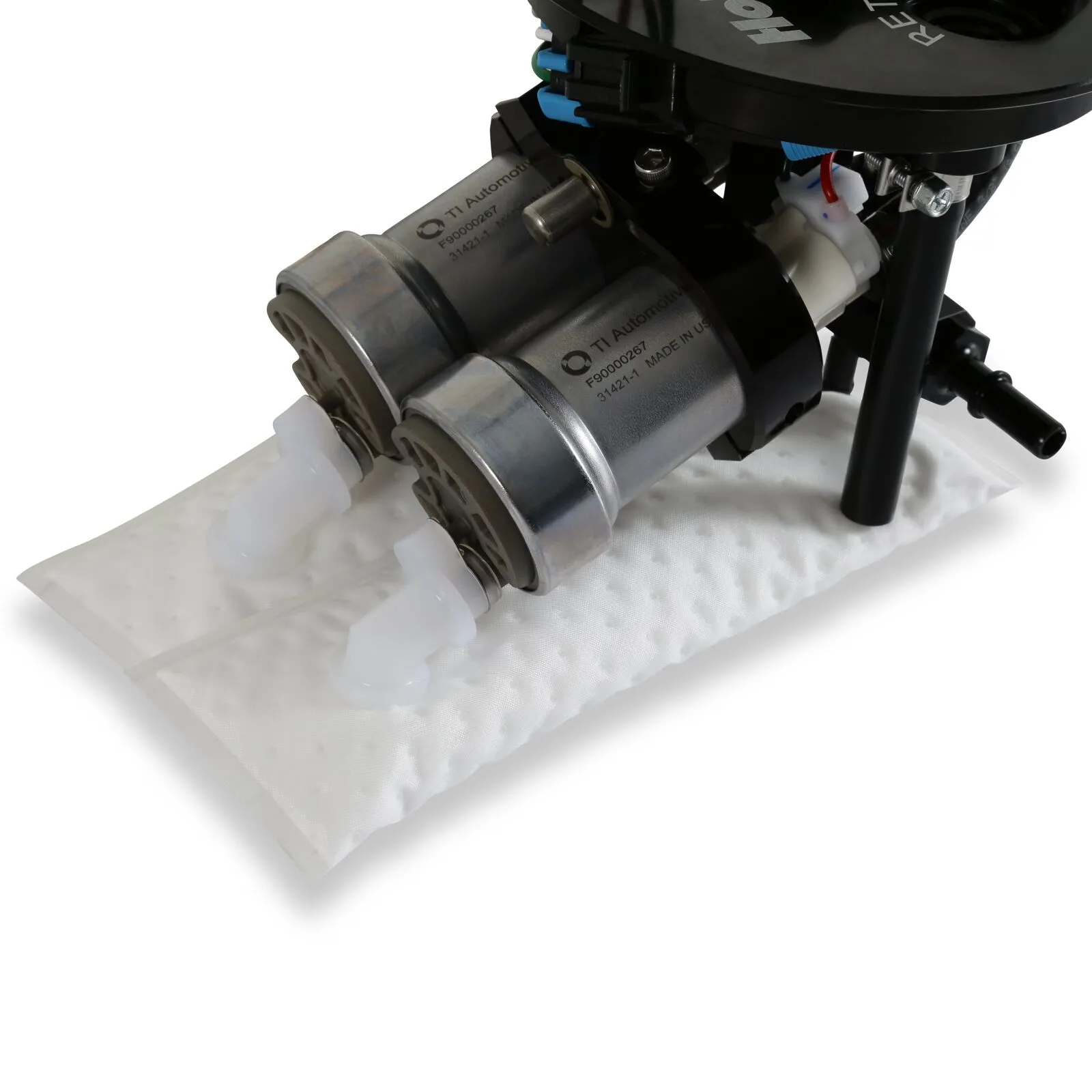 The fuel pump module design starts with a billet pump flange assembly and connects it to dual 340 or 450 LPH fuel pumps for maximum fuel delivery. The module also includes two HydraMats to eliminate fuel starvation under hard acceleration or cornering. The Integrated Jet pump assembly allows retention of factory drivers side fuel pickup.