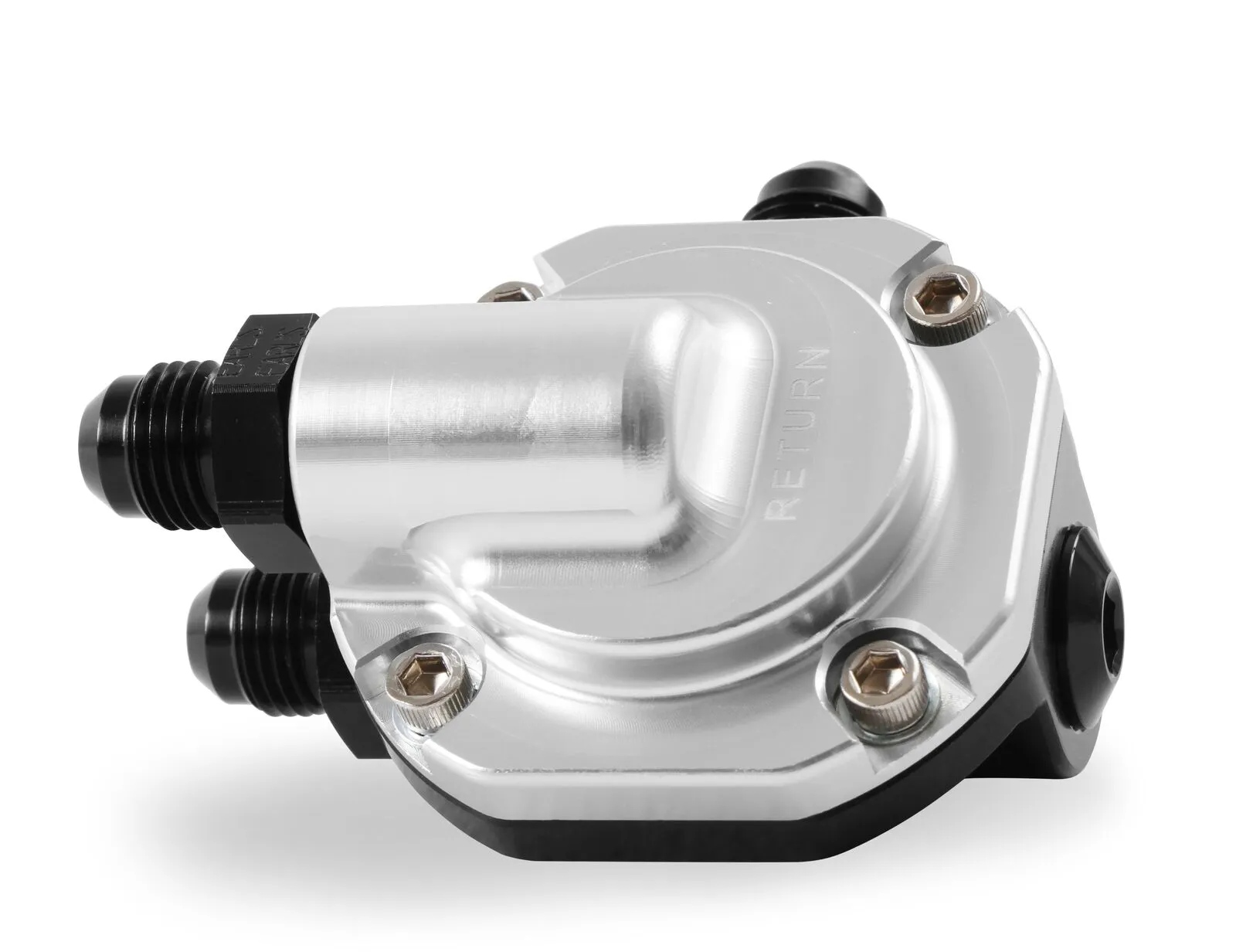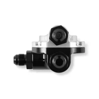 The billet EFI fuel pressure regulator is designed to be a space saving option when mounting on the end of the fuel rail or near the throttle body. The fuel pressure regulator is preset at 59.5 psi. The regulator cap can be removed and re-oriented to suit desired fuel routing. The billet 6061-T6 body has been machined for SAE6 ports and has three 6AN fittings and one extra plug included. An all black or black/clearcoat anodized finish is available.