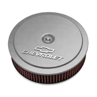 14" round air cleaner kits are available with a premium element featuring red pre-oiled cotton gauze (washable and reusable) or a mesh-reinforced paper element - both options come in 3 and 4 inch heights. Each air cleaner kit includes a polished or black Sure-Flo base (designed for Holley 4150 and 4160 and other carburetors with 5.125" diameter neck) and all mounting hardware necessary for installation. All GM Muscle Series accessories are available in four custom finishes: natural cast, polished, satin black, and factory orange (all finishes have machined "Chevrolet and Bowtie" logos aside from polished version).