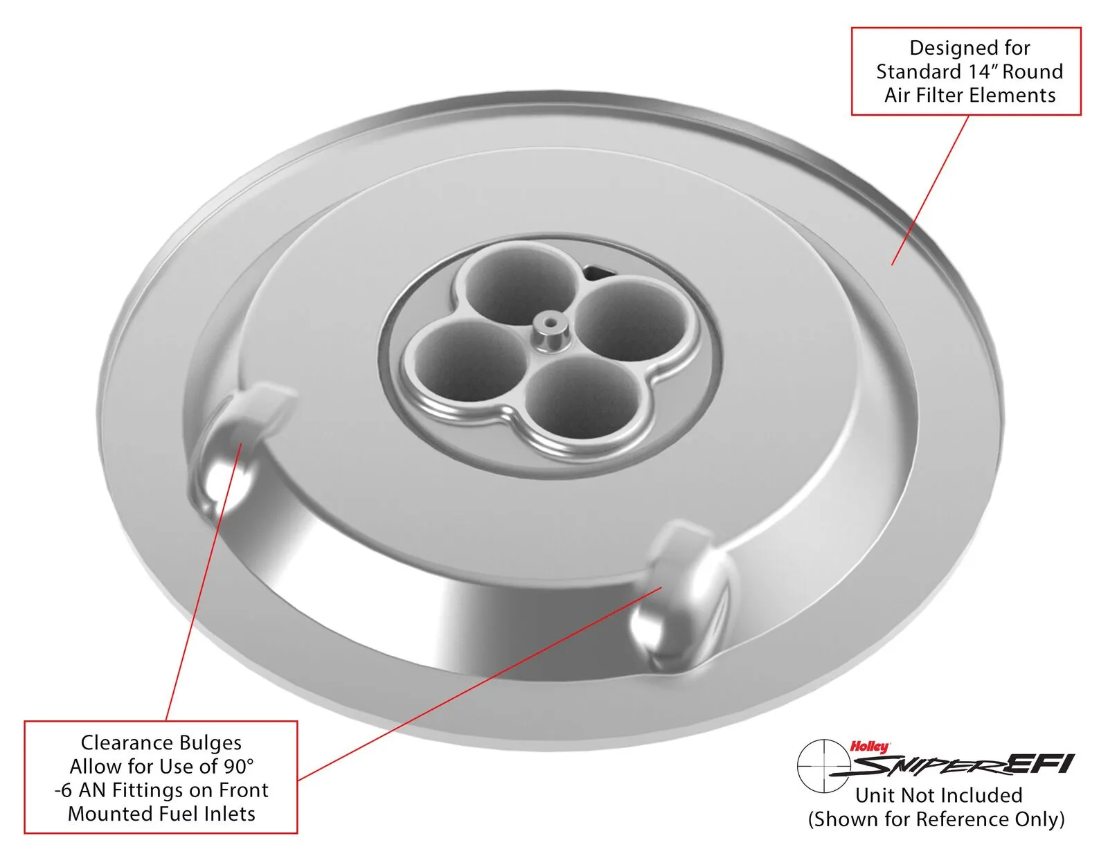 Complete your Sniper upgrade with our new 14" Sniper air cleaner assemblies. Each air cleaner assembly includes a stamped steel lid with an embossed Holley Sniper logo, a 1" drop base specifically designed for Sniper EFI applications, your choice of a 3" or 4" paper filter element, and all necessary mounting hardware. The included drop base fits all carbs and throttle bodies with a 5-1/8" neck - more specifically Sniper EFI 4150 throttle bodies with clearances for front mounted fuel fittings*, and Sniper EFI 2300 throttle bodies. Available in both black and chrome finishes to best match your SniperEFI unit.