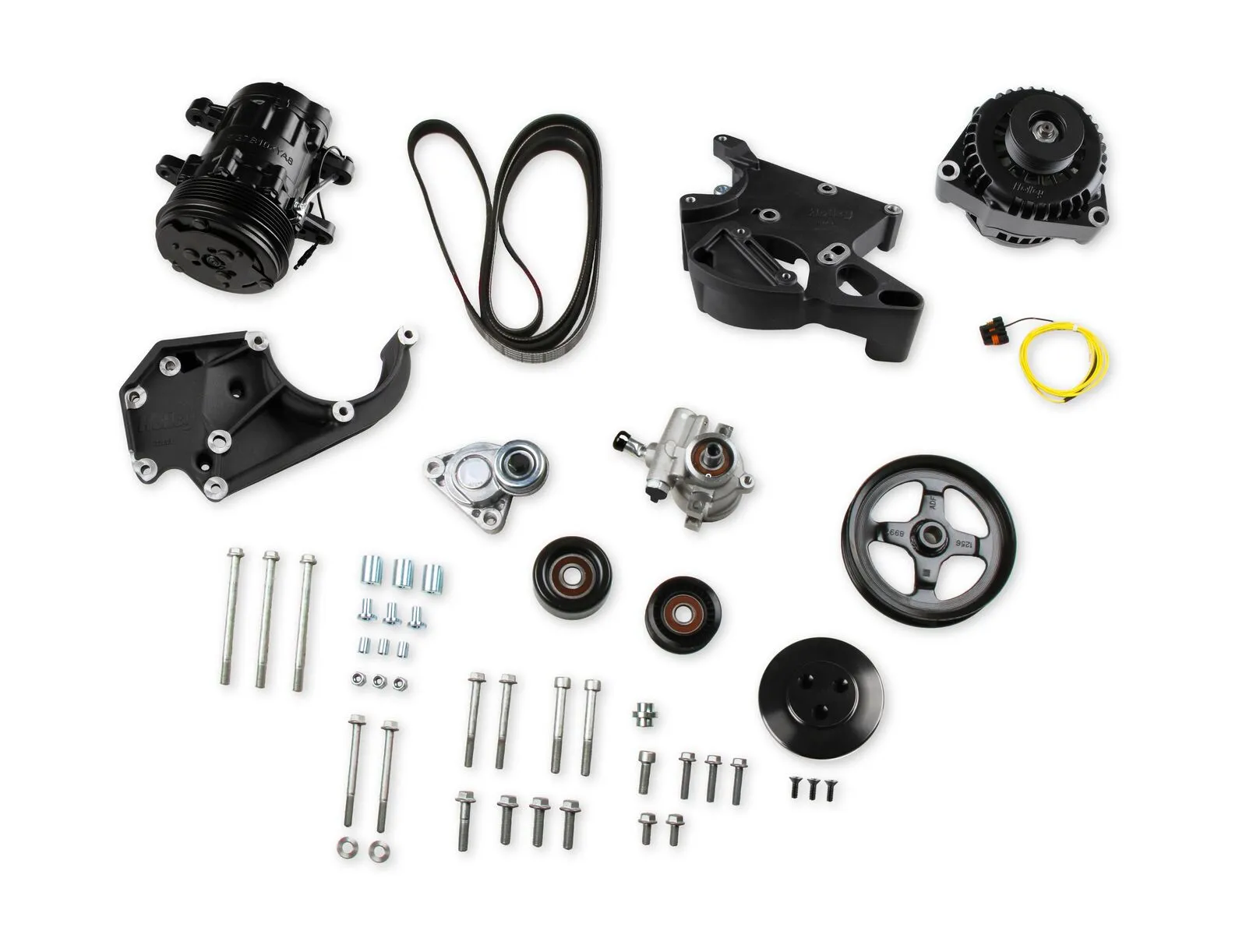 Now available from Holley are complete kits in black that have everything needed for the application including the belt. Included are accessories, pulleys, tensioner, and belt that are manufactured by OE part suppliers many of which are on production cars today.