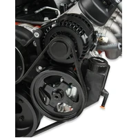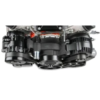 Holley's Premium Mid-Mount complete accessory system has all accessories pulled in tighter than other accessory drives. At the heart of the system is a "bracketless" design, where the accessories bolt directly to the water pump for a clean, integrated form. The design offers superb engine visibility to show off your horsepower, not your accessories. Among the many swap friendly features are bottom heater outlets for clearance in tight applications. The Holley designed alternator is just as innovative. This premium alternator utilizes 6-phase technology as found on the C7 Corvette. The water pump also shares its design efficiencies with that of the C7 Corvette. The compact and reliable SD7 A/C compressor and Type II P/S pump with baffled reservoir are also integrated.
