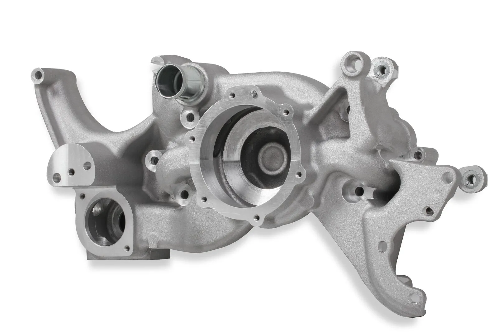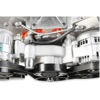 Holley's Mid-Mount complete accessory system has all accessories pulled in tighter than other accessory drives. At the heart of the system is a "bracketless" design, where the accessories bolt directly to the water pump for a clean, integrated form. The design offers superb engine visibility to show off your horsepower, not your accessories. Among the many swap friendly features are bottom heater outlets for clearance in tight applications. The Holley designed alternator is just as innovative. This premium alternator utilizes 6-phase technology as found on the C7 Corvette. The water pump also shares its design efficiencies with that of the C7 Corvette. The compact and reliable SD7 A/C compressor and Type II P/S pump with baffled reservoir are also integrated.