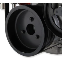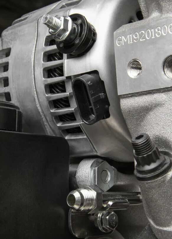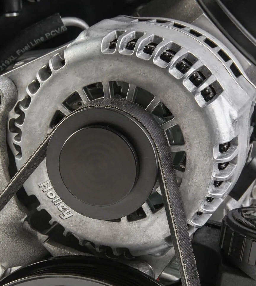 Holley's Mid-Mount complete accessory system has all accessories pulled in tighter than other accessory drives. At the heart of the system is a "bracketless" design, where the accessories bolt directly to the water pump for a clean, integrated form. The design offers superb engine visibility to show off your horsepower, not your accessories. Among the many swap friendly features are bottom heater outlets for clearance in tight applications. The Holley designed alternator is just as innovative. This premium alternator utilizes 6-phase technology as found on the C7 Corvette. The water pump also shares its design efficiencies with that of the C7 Corvette. The compact and reliable SD7 A/C compressor and Type II P/S pump with baffled reservoir are also integrated.