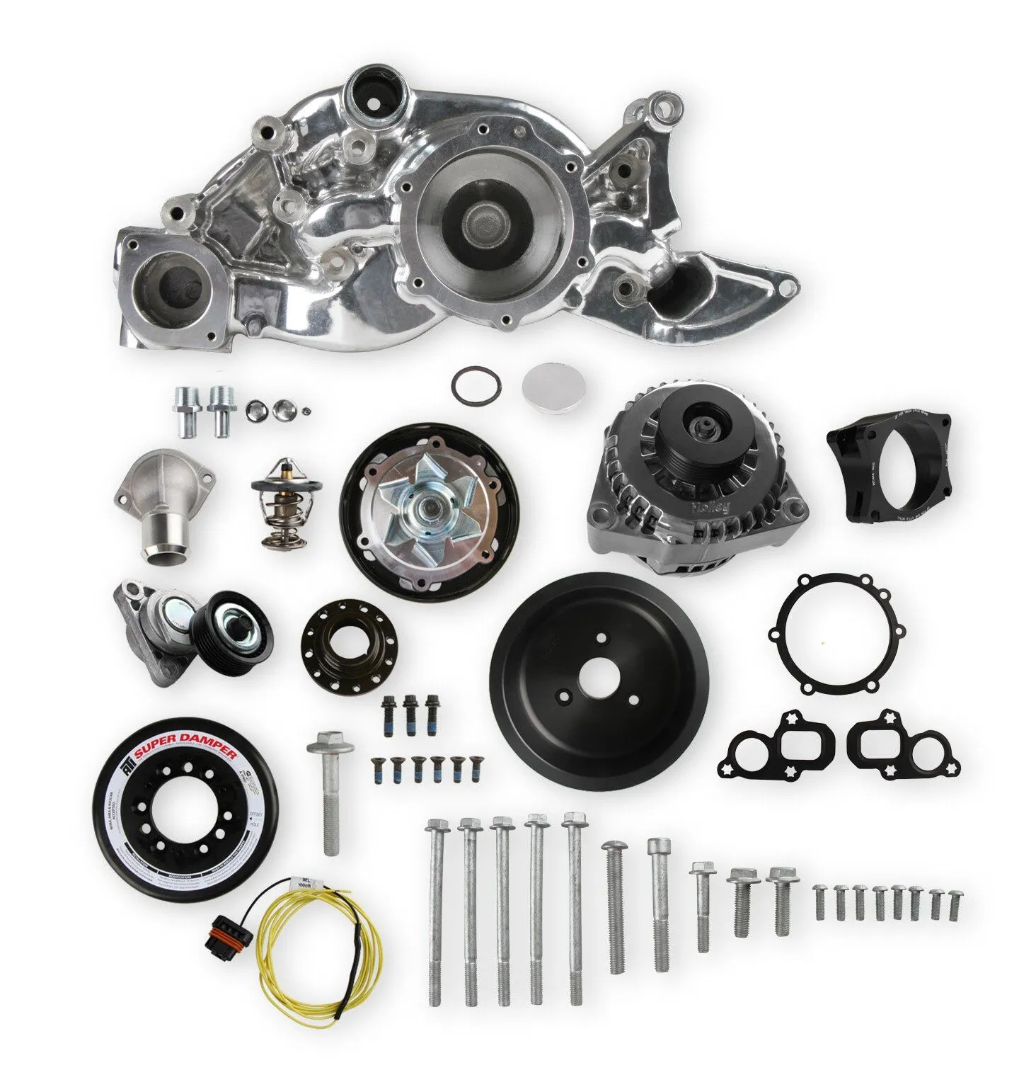 When we say "complete", we mean complete. The Mid-Mount system comes with everything you need. All accessories are included; the water pump, alternator, and an SFI certified damper w/hard anodized billet crank pulley. All pulleys and the belt are supplied. Even heater hose adapters, and the alternator plug/harness are included. Easy assembly was a priority during the entire development of this accessory solution. Color graphical instructions walk you through every step of the ultra-easy installation.
