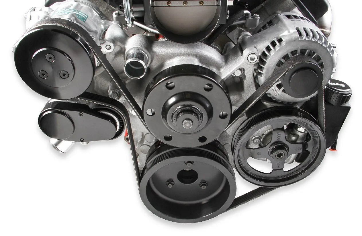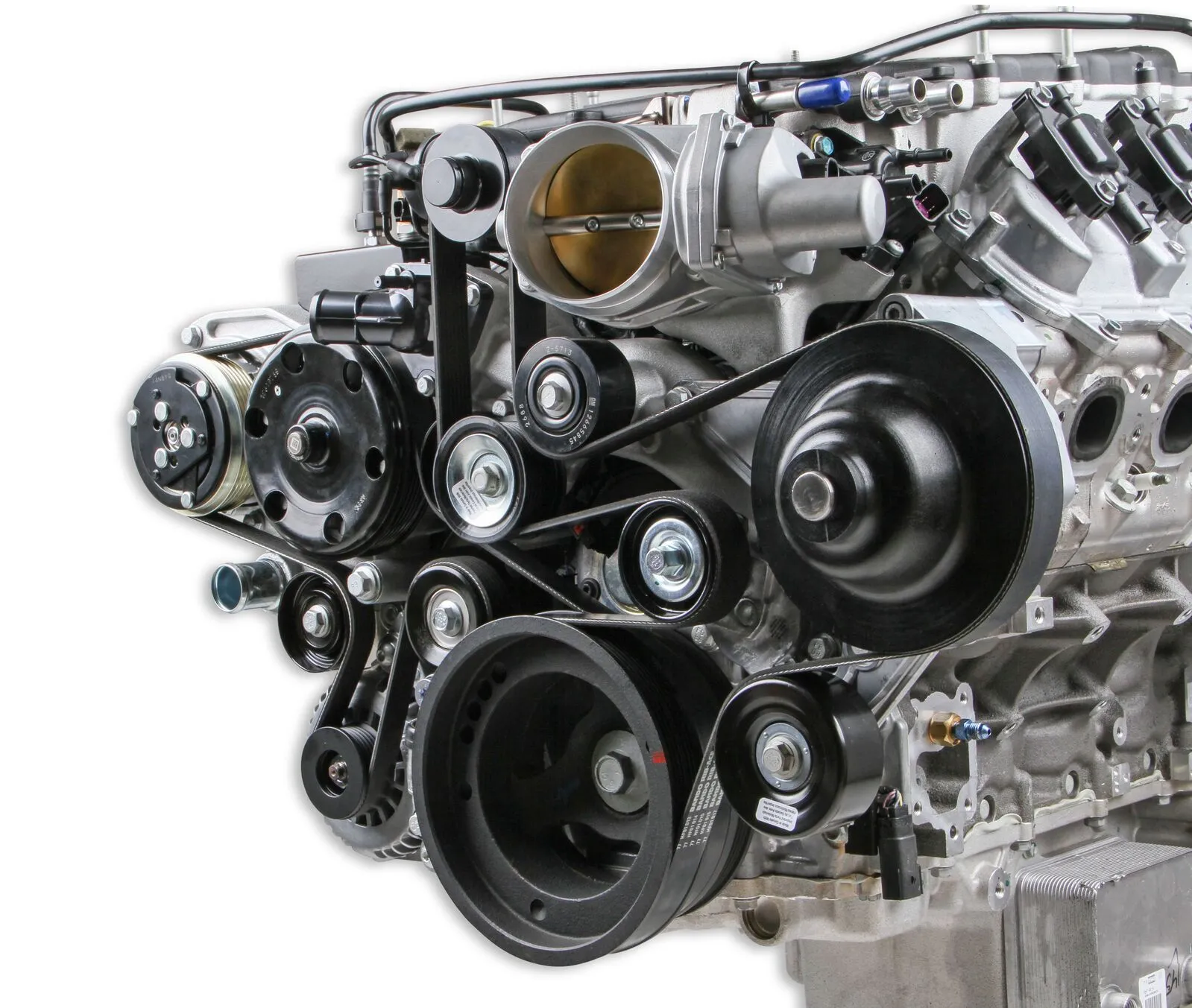 Holley's complete accessory systems for LT4 and LT5 applications have all accessories pulled up and in tight. Plus, they add the much needed hydraulic power steering solution. There are no shortcuts here. Holley incorporates a splined dual bearing system that eliminates all belt stresses on the P/S pump's internal bearings, assuring long life. The supercharger drive maintains the original and optimized belt path and tensioner. The accessory layout is as if the original manufacturer had designed it for your swap application. Included with each drive system is a throttle body angle correcting adapter that better positions the TB for swap applications as opposed to the aggressive original application intended angles. Versions of these accessory drives are available for both wet and dry sump applications.