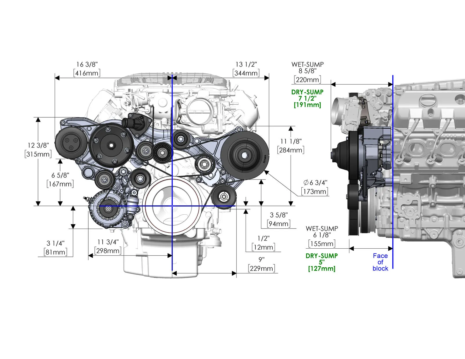 Holley's complete accessory systems for LT4 and LT5 applications have all accessories pulled up and in tight. Plus, they add the much needed hydraulic power steering solution. There are no shortcuts here. Holley incorporates a splined dual bearing system that eliminates all belt stresses on the P/S pump's internal bearings, assuring long life. The supercharger drive maintains the original and optimized belt path and tensioner. The accessory layout is as if the original manufacturer had designed it for your swap application. Included with each drive system is a throttle body angle correcting adapter that better positions the TB for swap applications as opposed to the aggressive original application intended angles. Versions of these accessory drives are available for both wet and dry sump applications.