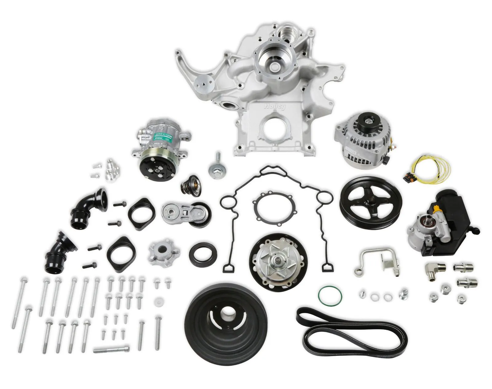 Holley's complete, mid-mount accessory system has all accessories pulled in tighter than other accessory drives. At the heart of the system is a "bracketless" design (patent pending), where the accessories bolt directly to the timing cover for a clean, integrated system. The design offers superb engine visibility to show off your horsepower, not your accessories. Among the many swap friendly features are two optional heater connection configurations. The innovative Holley premium alternator incorporates 6-phase and square wire technology. The compact and reliable SD7 A/C compressor and Type II P/S pump with baffled reservoir are also integrated. The kit utilizes Holley's proven cartridge style water pump. When we say "complete", we mean complete. The Mid-Mount system comes with everything you need. All accessories are included; the water pump, A/C compressor, Alternator, P/S pump with reservoir, and the crank damper. All pulleys and the belt are supplied. Even heater hose adapters, power steering to -6 AN hardline, and the alternator plug/harness are included. Easy assembly was a priority during the entire development of this accessory solution. Color graphical instructions walk you through every step of the ultra-easy installation.