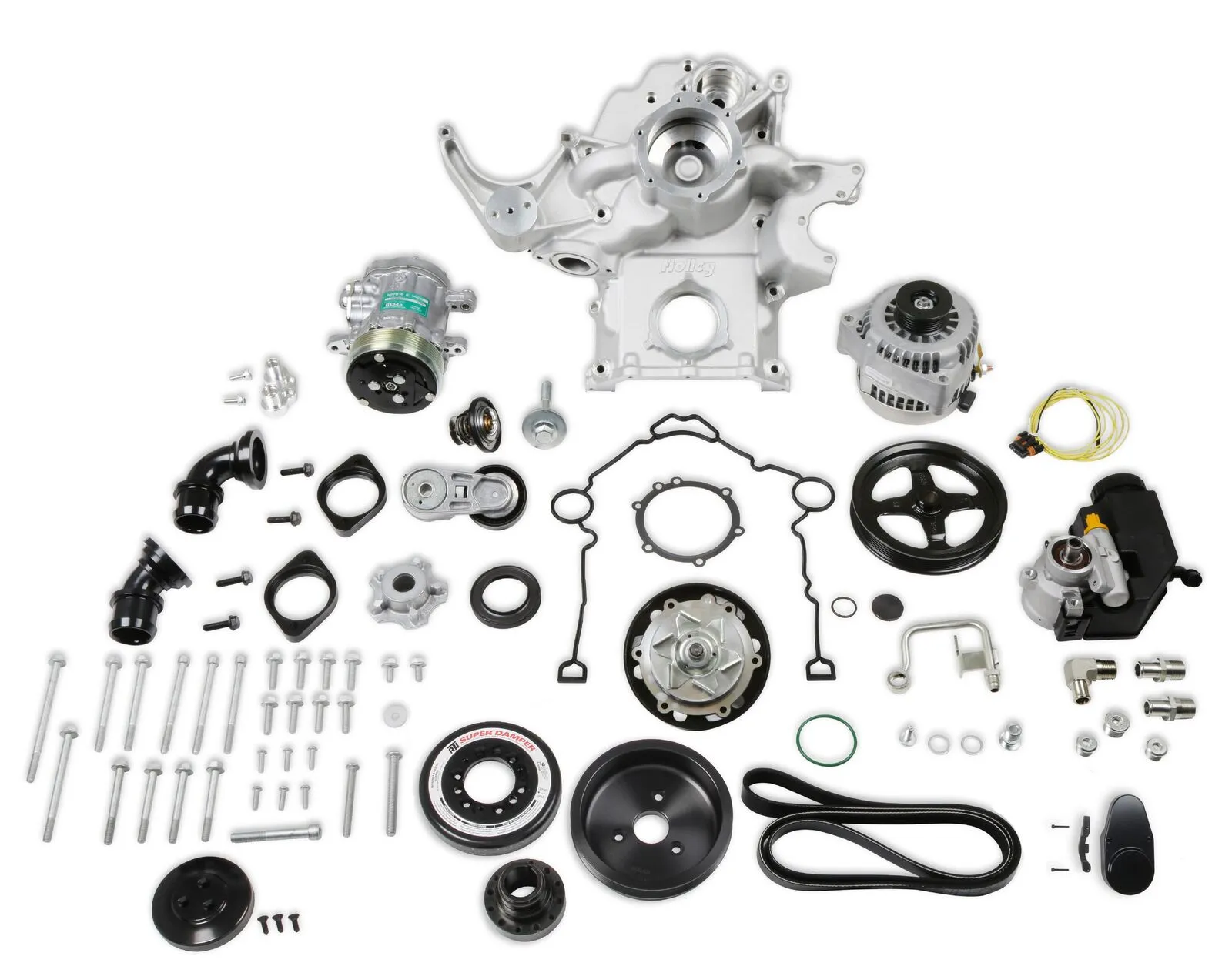 Holley's complete, mid-mount accessory system has all accessories pulled in tighter than other accessory drives. At the heart of the system is a "bracketless" design (patent pending), where the accessories bolt directly to the timing cover for a clean, integrated system. The design offers superb engine visibility to show off your horsepower, not your accessories. Among the many swap friendly features are two optional heater connection configurations. The innovative Holley premium alternator incorporates 6-phase and square wire technology. The compact and reliable SD7 A/C compressor and Type II P/S pump with baffled reservoir are also integrated. The kit utilizes Holley's proven cartridge style water pump. When we say "complete", we mean complete. The Mid-Mount system comes with everything you need. All accessories are included; the water pump, A/C compressor, Alternator, P/S pump with reservoir, and the crank damper. All pulleys and the belt are supplied. Even heater hose adapters, power steering to -6 AN hardline, and the alternator plug/harness are included. Easy assembly was a priority during the entire development of this accessory solution. Color graphical instructions walk you through every step of the ultra-easy installation.