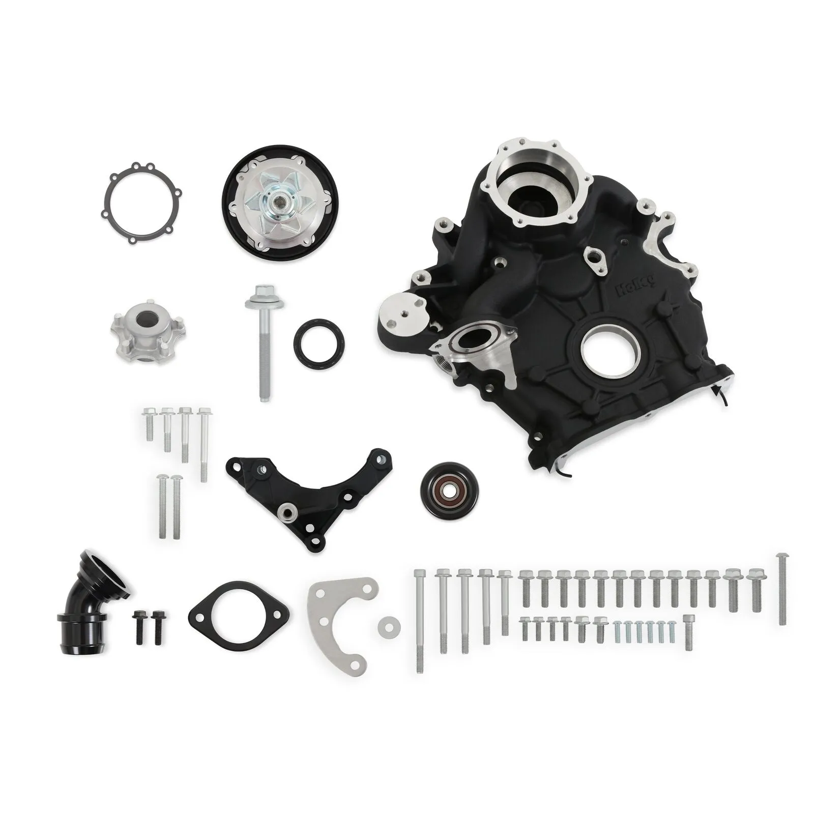 Holley's high-mount accessory drive has everything pulled up and in tighter than other options. The patent pending accessory drive incorporates the timing cover, water pump, and alternator and can also be configured with A/C and/or P/S if desired. This system works with the factory crank pulley, as well as aftermarket damper/pulleys.