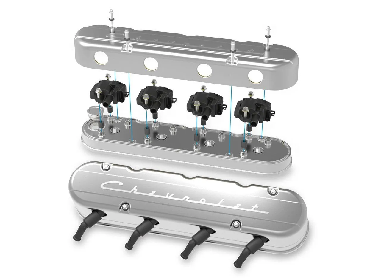 Holley's new 2-Piece LS valve covers are a great way to update the look of your LS engine without the use of complicated adapter systems or the hassle of remote coil relocation. These modular LS valve covers feature an OE height, internally baffled LS valve cover base with integrated coil mounts for popular Gen I and Gen V style LS coil bodies (coils not included), and a "Chevrolet" branded overcover that hides the unsightly LS coils and messy wiring harness - allowing the full performance benefits of coil-on-cover ignition setups without the robotic styling. Each modular coil cover features a prominent vintage "Chevrolet" logo that matches various other GM licensed Holley products. The coil cover also features cast-in provisions for the spark plug boots and coil wiring harness so no extensions or custom wiring is required.