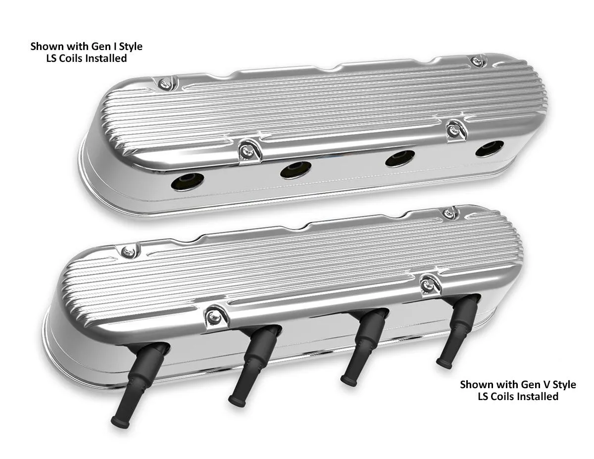 Holley's new 2-Piece LS valve covers are a great way to update the look of your LS engine without the use of complicated adapter systems or the hassle of remote coil relocation. These modular LS valve covers feature an OE height, internally baffled LS valve cover base with integrated coil mounts for popular Gen I and Gen V style LS coil bodies (coils not included), and a vintage style finned overcover that hides the unsightly LS coils and messy wiring harness - allowing the full performance benefits of coil-on-cover ignition setups without the robotic styling. Each modular coil cover features a simplified version of our Vintage Series style fins that seamlessly blends with other finned Holley dress-up accessories such as our LS valley covers and 14" round air cleaners. The coil cover also features cast-in provisions for the spark plug boots and coil wiring harness so no extensions or custom wiring is required.