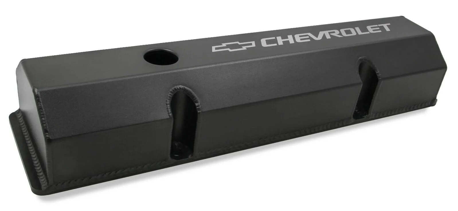 Holley is pleased to release its latest fully licensed product--GM Track Series Fabricated Aluminum Valve Covers. The GM Track Series family of valve covers gives you an excellent way to add a high-end fabricated look combined with a lightweight and tough valve cover for your favorite Chevy engine. These valve covers are constructed of 6061 T5 sheet aluminum, feature a laser etched "Chevrolet" and Bow Tie logo, and precision TIG welded for a proper fit. They are available in silver anodized or black coated finishes along with various heights to clear most popular rocker arm combinations. All of our valve covers include mounting hardware for quick and simple installation.