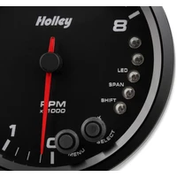 Holley analog-style standalone tachometers with internal LED shift lights gives you a simple yet modern way to measure engine RPM's. They are available in both 8,000 RPM and 10,000 RPM versions and their slim style mounting requires very little dash space depth for mounting. Our tachometers are practically universal since they work with most gasoline engines and programmable from 0.5 - 6 Pulses Per Revolution (PPR). All of our Holley tachometers feature dimmable LED backlighting to ensure you can always see the right RPM no matter the environment. Each tachometer is tested to insure top quality accurate readings. Holley tachometers are designed for a 3-3/8" or 4-1/2" opening and available with black face with white lettering or white face with black lettering.