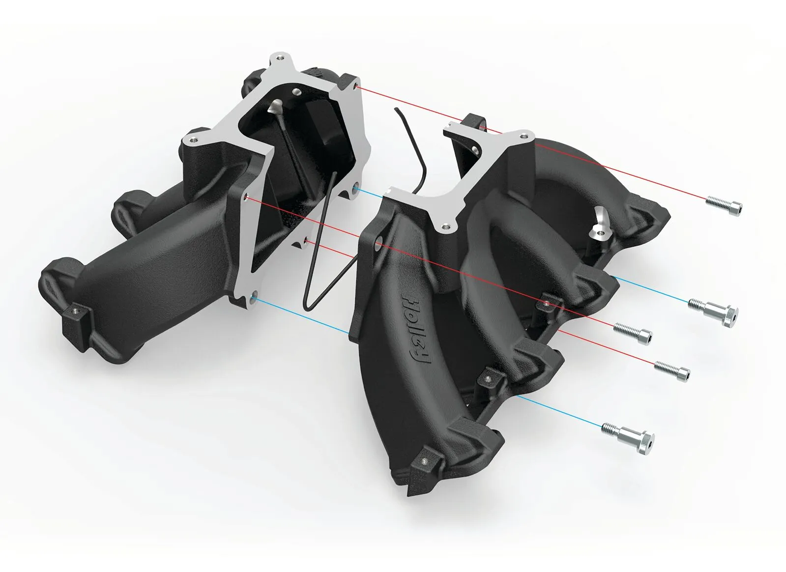 The Holley LS Race manifold incorporates a split feature, which allows disassembly of the intake for direct access to internal plenum and port surfaces, making custom porting and matching a snap. With shoulder bolt locators and O-ring seal, reassembly is simple and precise.