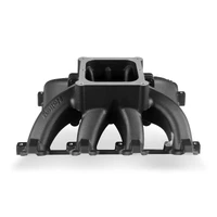 The manifold with AN-8 fuel rails fits GM LS Gen III engines with cathedral port heads and has a 4500 Dominator style carb flange for carburetors, EFI throttle bodies, or EFI throttle body elbows, and is configured with a LS MAP sensor port along with other NPT plenum vacuum or air-temp sensor ports.