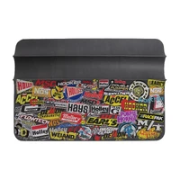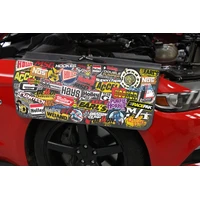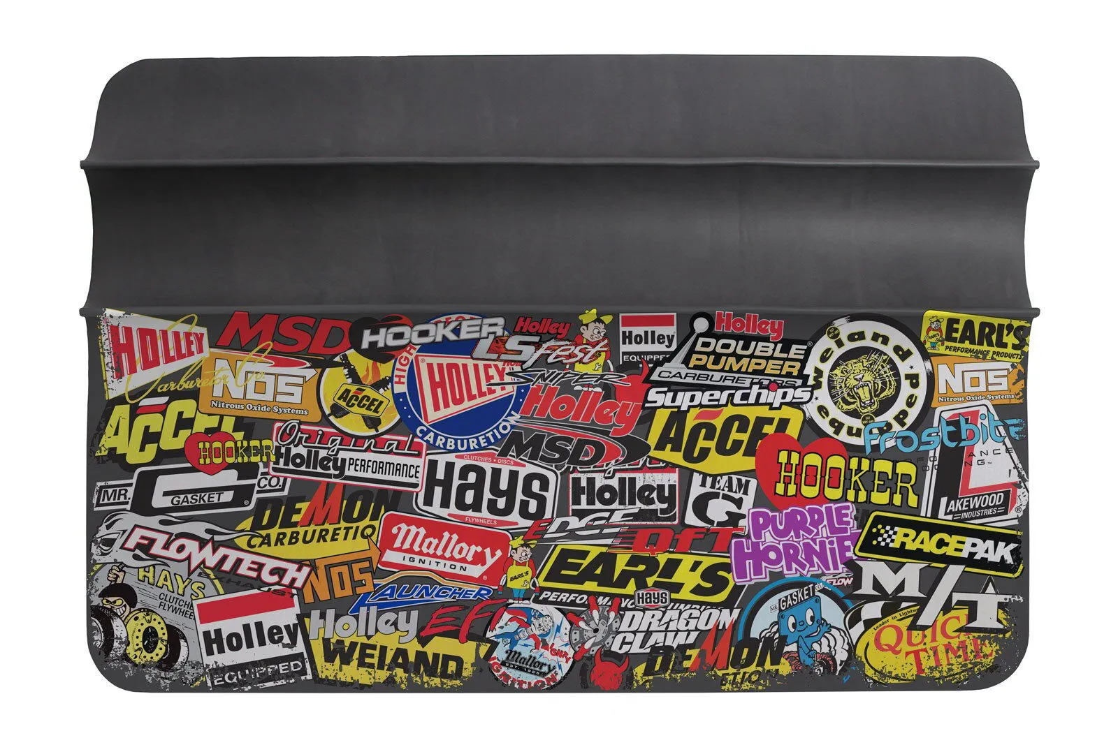 Protect the fenders on your favorite ride from dents, scratches, and greasy messes with our Holley/MSD Brands "Sticker Bomb" fender cover. This colorful cover is designed to mimic the popular past time of plastering stickers all over a shop fridge or toolbox. Our heavy-duty fender cover features a durable printed vinyl outer layer with a scratch-resistant sponge foam inner layer to keep the cover in place. Fully sewn seams create a useful tool ridge on the top side. The edges of the cover's printed area are made to look like old and weathered stickers for that vintage look. It is a great cover for any gearhead and durable enough for everyday shop use.