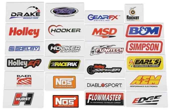 Brand decals include the following: B&M, Hooker Blackheart, Simpson, Racepak, Diablosport, AEM, Hooker, Accel, NOS (x2), HURST, Holley, Earl's, Flowmaster, Holley Sniper EFI, Holley EFI, Detroit Speed & Engineering, GearFX, Carroll Shelby Wheel Company, Drake Muscle Cars, Baer Brakes, Rocket Racing Wheels, Flowtech, MSD - All 24 stickers packed together in a clear bag.