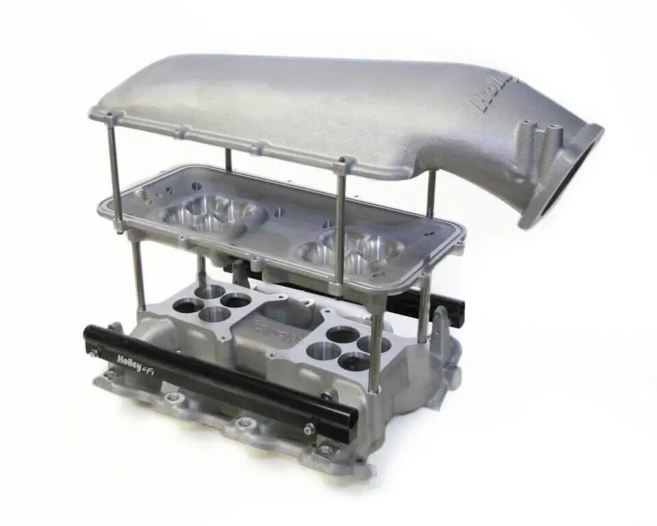 This manifold is modular, and the plenum adapter (PN 300-267) will accept all of the popular Holley LS Hi-Ram plenum tops as a foundation for custom induction systems.