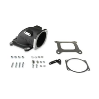 This cast EFI intake elbow allows the use of GM LS throttle bodies on any intake manifold w/ the 4150 mounting flange. Slotted mounting holes & dual throttle cable mounting bracket bosses allow the elbow & throttle body to be mounted forward, sideways, or rearward. Features (4) vacuum ports, MAP sensor port, machined / port matched to 4150 gasket, and 100° throttle body angle for extra hood clearance. Includes MAP sensor port cover, gaskets & hardware.