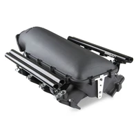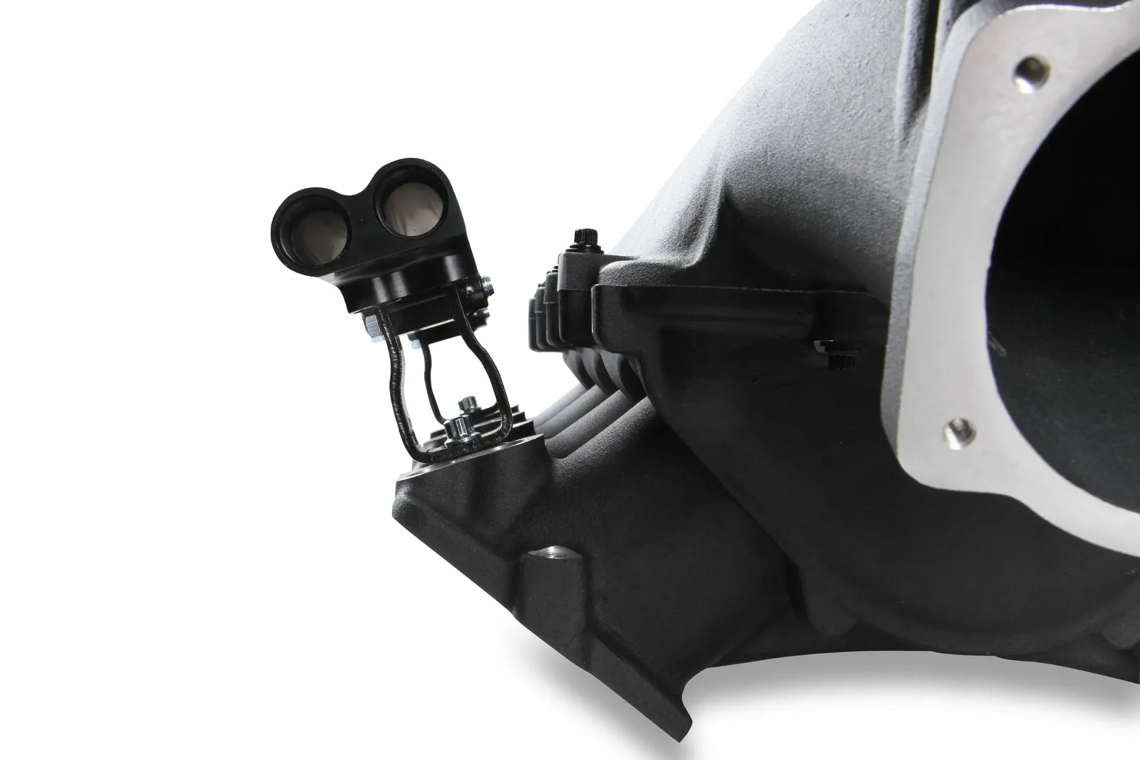 The 300-624(satin) & 300-624BK(black) intake manifold kit provides two injectors per cylinder for hi-volume fuel demands, flexible fuel supply strategies, and dual-fuel capability. The short runner, low-profile base intake manifold was conceived to package plenum-mounted intercoolers for high-boost turbocharged or supercharged induction systems with a shorter overall height not possible with other existing intake manifolds. The plenum top is configured to be fitted with 105 mm throttle body part number 112-581 or similar models. The dual fuel injector fuel rail kits come with two sets of brackets. A set for long (usually standard length) fuel injectors and a set for short (such as Pico, or LS7) fuel injectors.