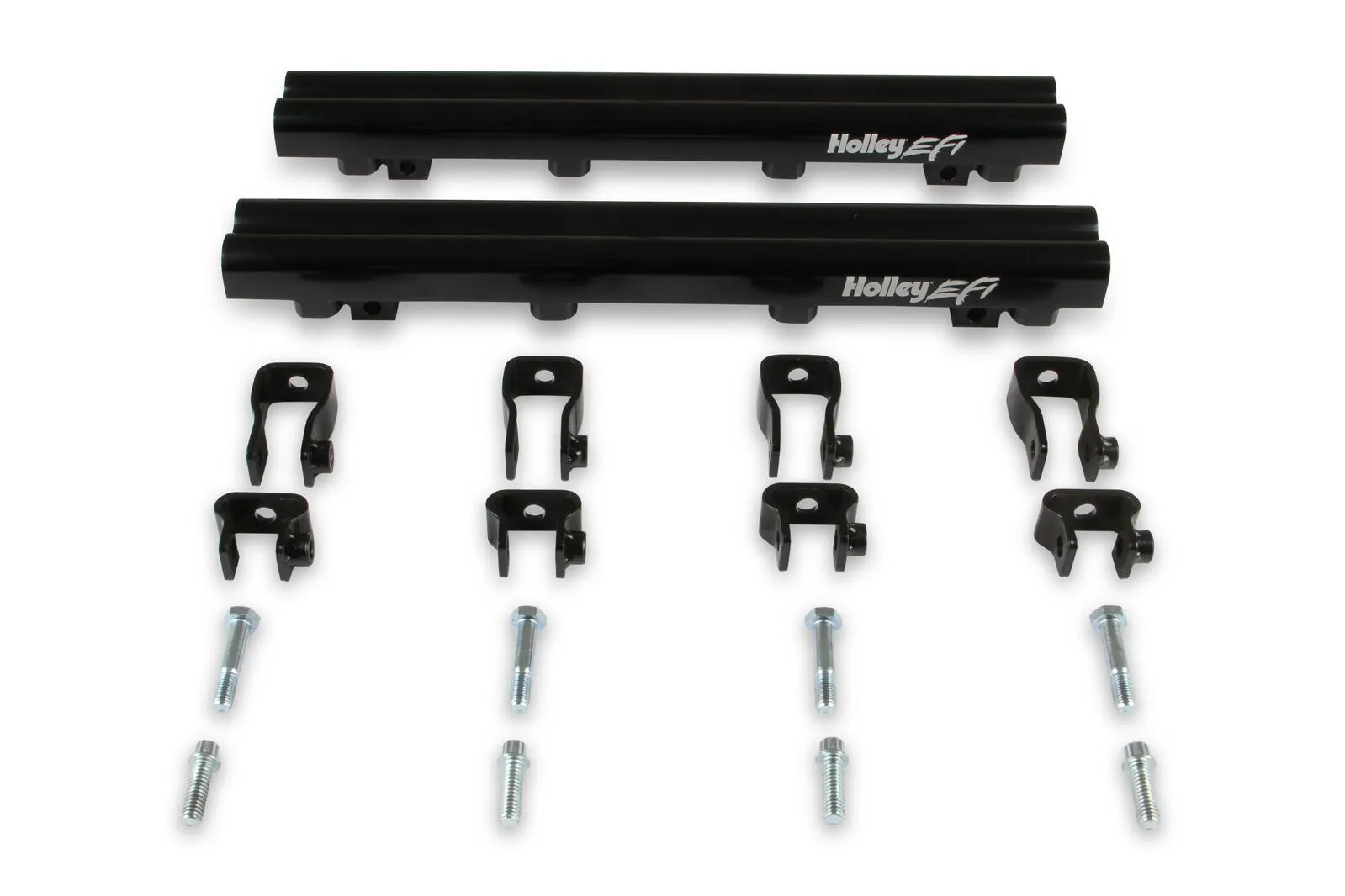 - Dual-injector, separate-passage, high-volume fuel rails with mounting hardware, dual-fuel capable, 8 AN o-ring ports