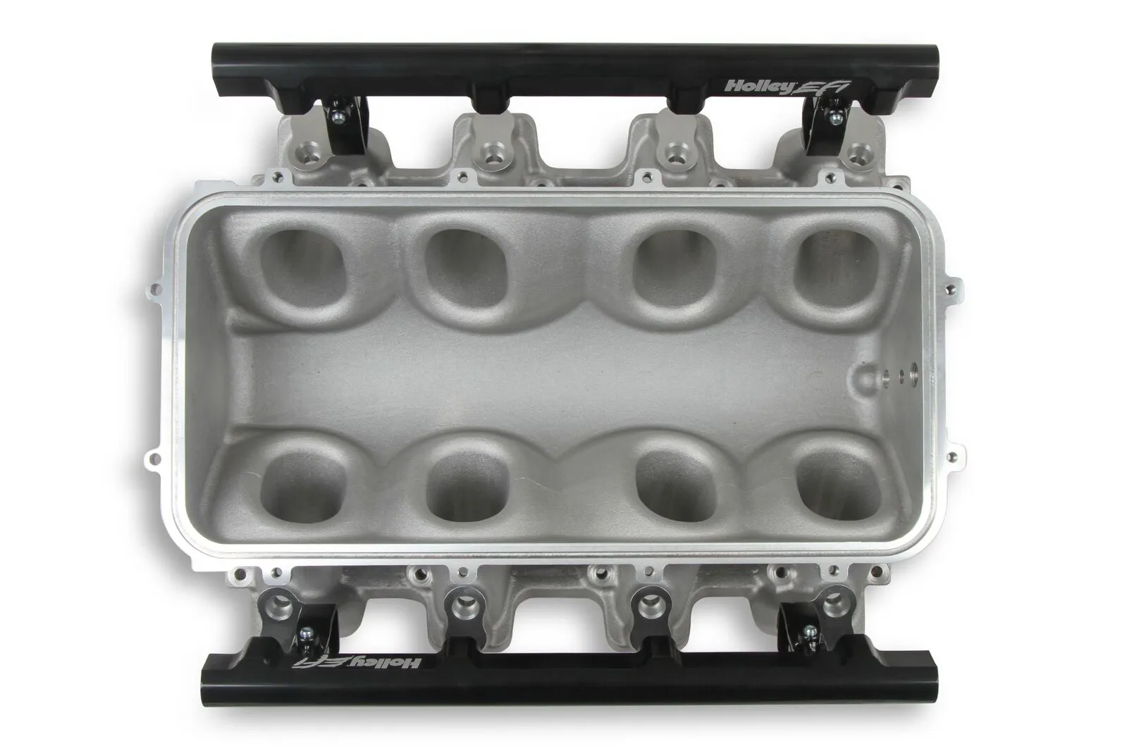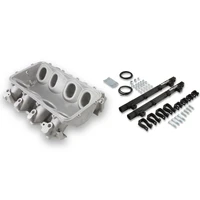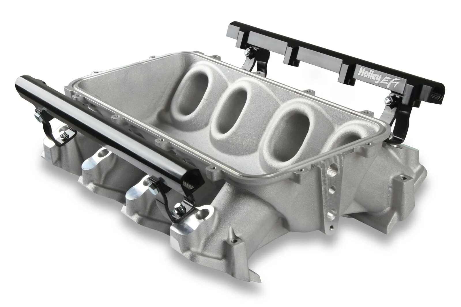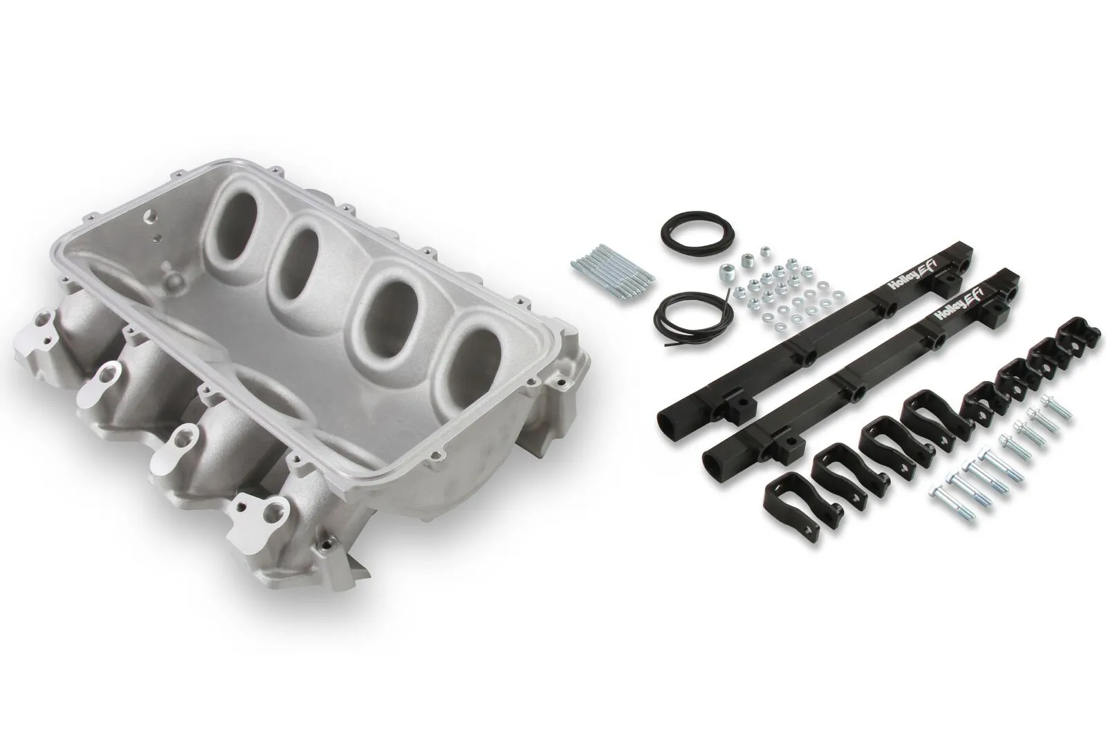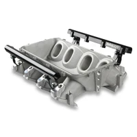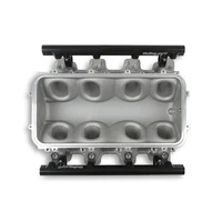 The Holley LS3 Lo-Ram intake manifold kits are designed for GM LS Gen III and IV engines equipped with GM LS3/L92 cylinder heads. These intake manifolds will work with OE or aftermarket cylinder heads. The Lo-Ram intake manifolds are designed for forced induction (supercharged or turbocharged) engine applications and the 105 mm throttle body part number 112-581 or similar models. The base intake manifold is designed with a low height to aid the packaging of a plenum-mounted air-to-water intercooler in a top-feed configuration. Additional manifold designs include both single and dual injector options. Available with both as-cast satin and black power-coat finishes. High volume fuel rails for eight and sixteen injector configurations. Mounting hardware included with 3/4-16 O-ring ports (8 AN)