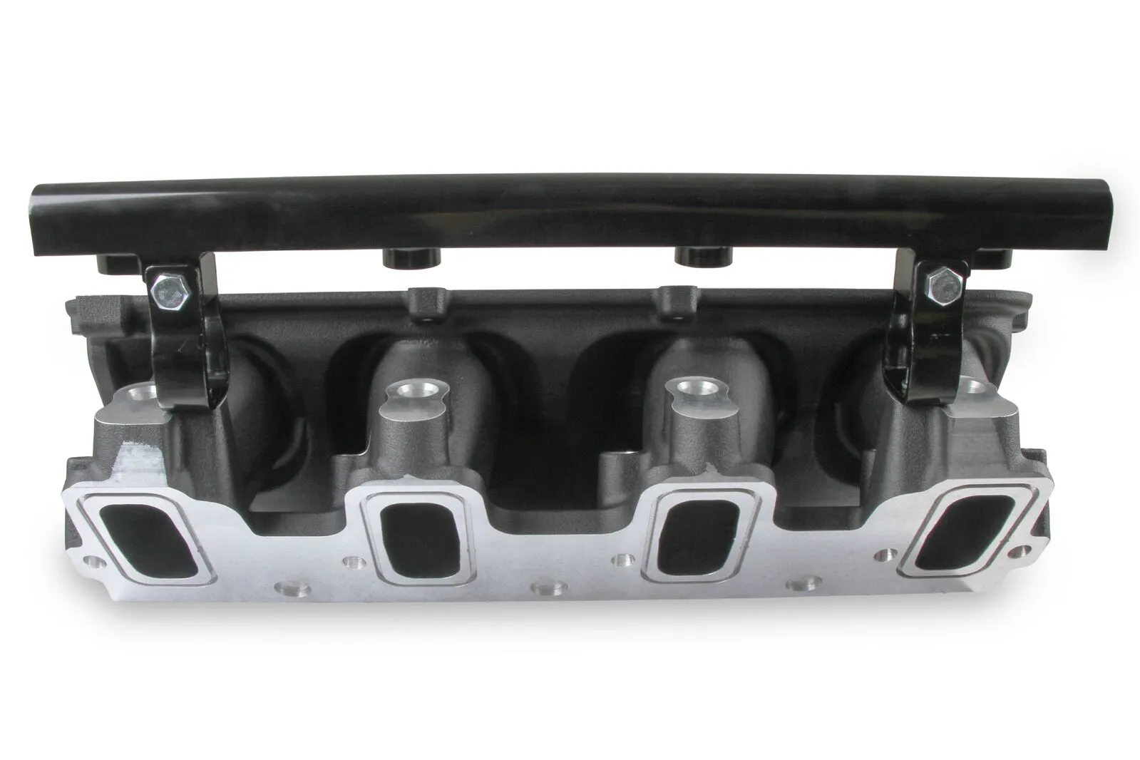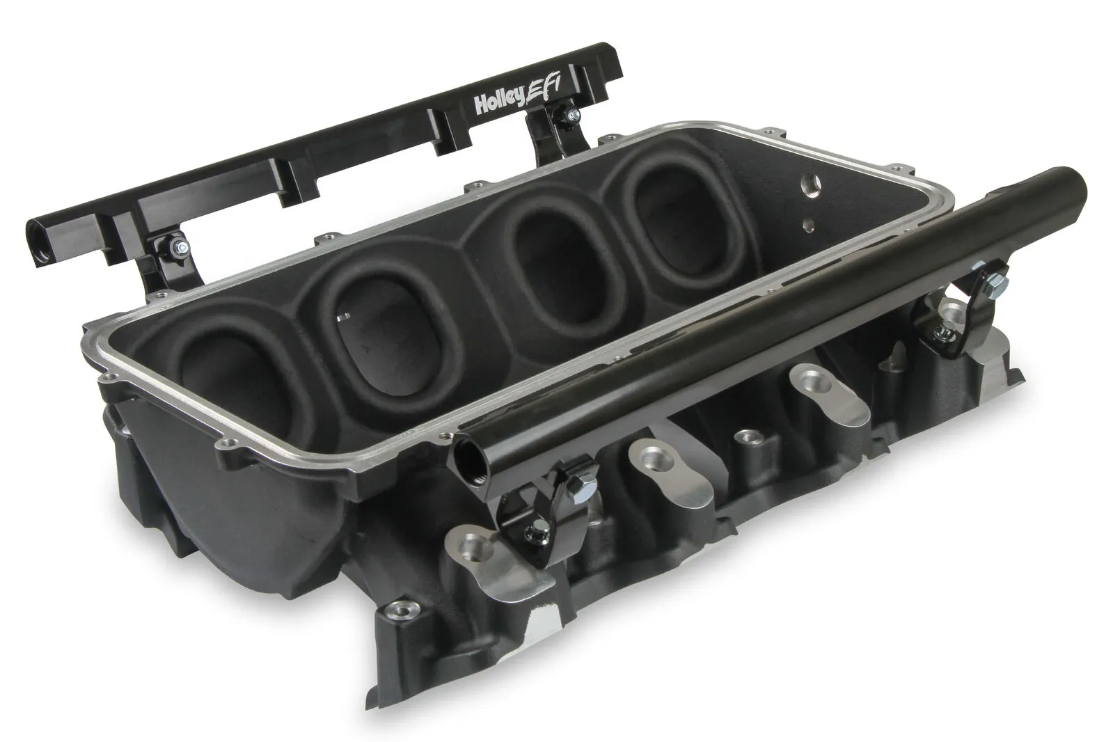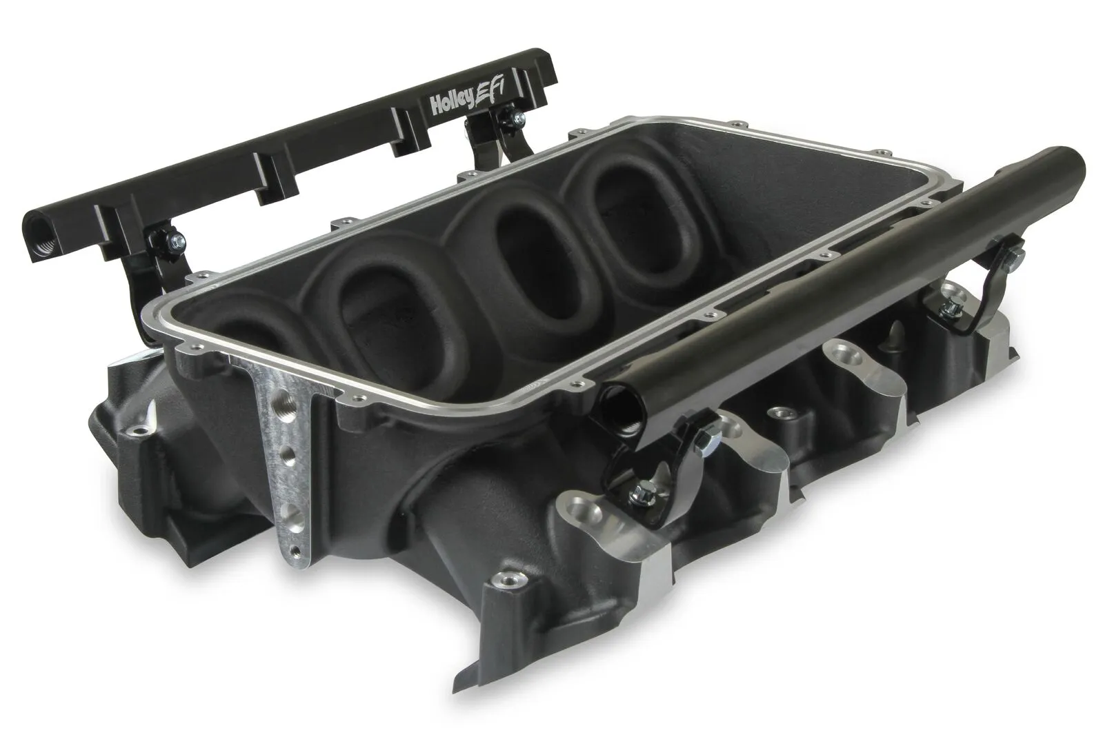 The Holley LS3 Lo-Ram intake manifold kits are designed for GM LS Gen III and IV engines equipped with GM LS3/L92 cylinder heads. These intake manifolds will work with OE or aftermarket cylinder heads. The Lo-Ram intake manifolds are designed for forced induction (supercharged or turbocharged) engine applications and the 105 mm throttle body part number 112-581 or similar models. The base intake manifold is designed with a low height to aid the packaging of a plenum-mounted air-to-water intercooler in a top-feed configuration. Additional manifold designs include both single and dual injector options. Available with both as-cast satin and black power-coat finishes. High volume fuel rails for eight and sixteen injector configurations. Mounting hardware included with 3/4-16 O-ring ports (8 AN)