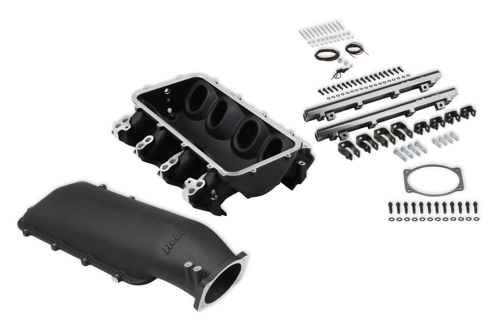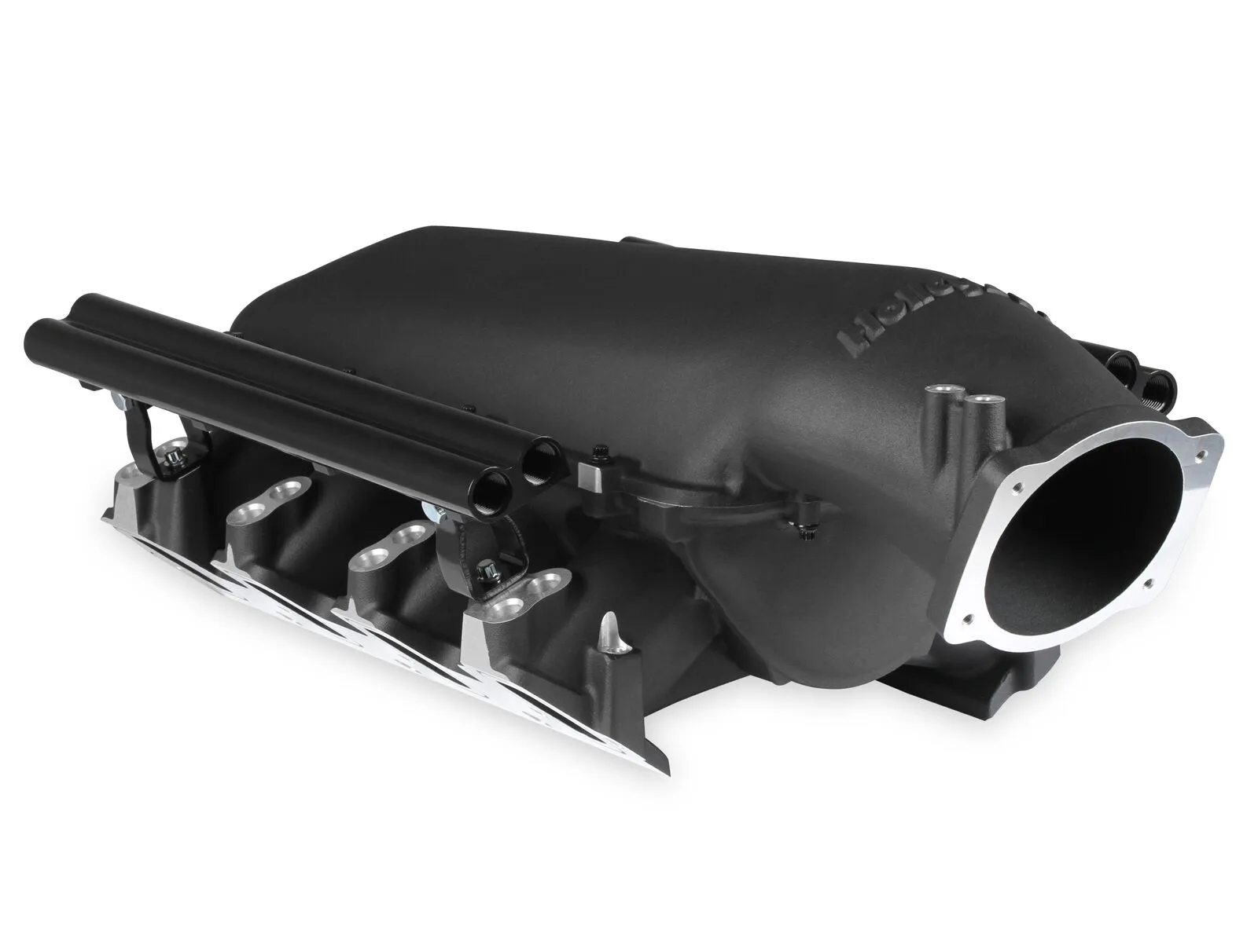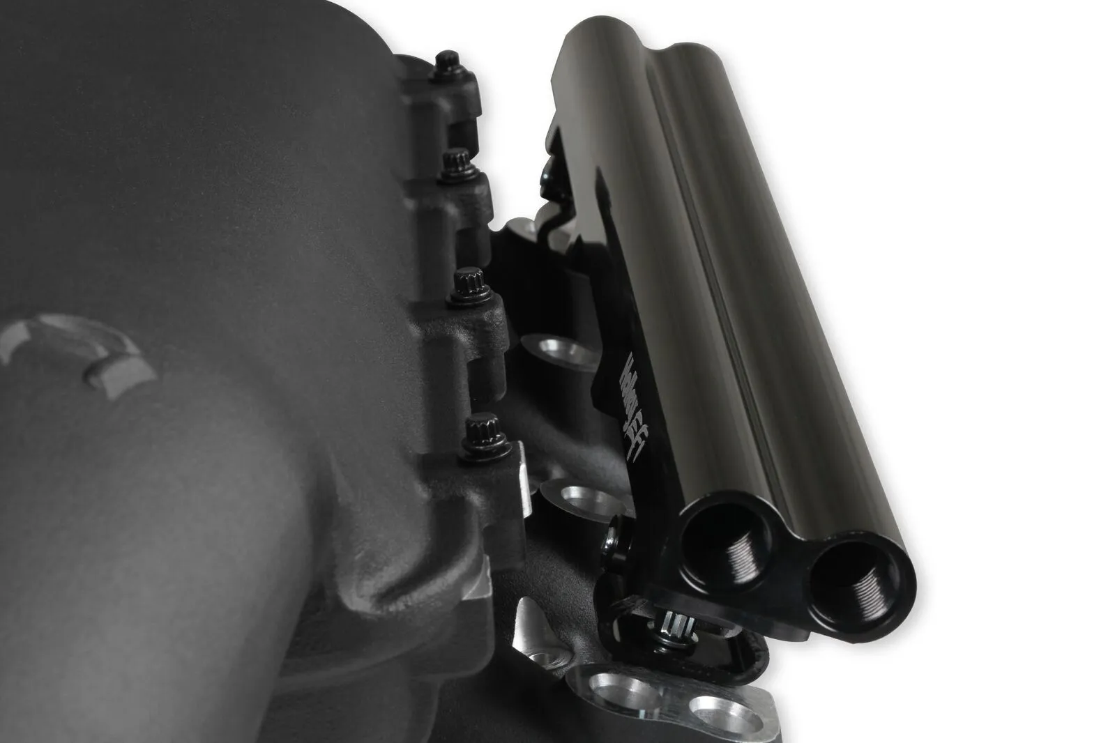 The Holley LS3 Lo-Ram intake manifold kits are designed for GM LS Gen III and IV engines equipped with GM LS3/L92 cylinder heads. These intake manifolds will work with OE or aftermarket cylinder heads. The Lo-Ram intake manifolds are designed for forced induction (supercharged or turbocharged) engine applications and the 105 mm throttle body part number 112-581 or similar models. The base intake manifold is designed with a low height to aid the packaging of a plenum-mounted air-to-water intercooler. Additional manifold designs include both single and dual injector options. Available with both as-cast satin and black power-coat finishes. High volume fuel rails for eight and sixteen injector configurations. Mounting hardware included with 3/4-16 O-ring ports (8 AN)