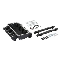The standard plenum top throttle body flange has a 105 mm opening to work with throttle body part number 112-581 or similar models. The top-feed plenum base intake manifold is designed with a reduced overall height to fit under a stock or mildly modified hood. The Lo-Ram provides a low profile modular intake manifold suitable for use with plenum mounted air-to-water intercoolers for boosted applications. Various Hi-Ram plenum top options are available to compliment the top-feed base intake manifold kits and fabrication flanges are offered to aid the fabrication of plenum tops for custom installations. Available for OE direct fuel injection only and with port fuel injection provisions.