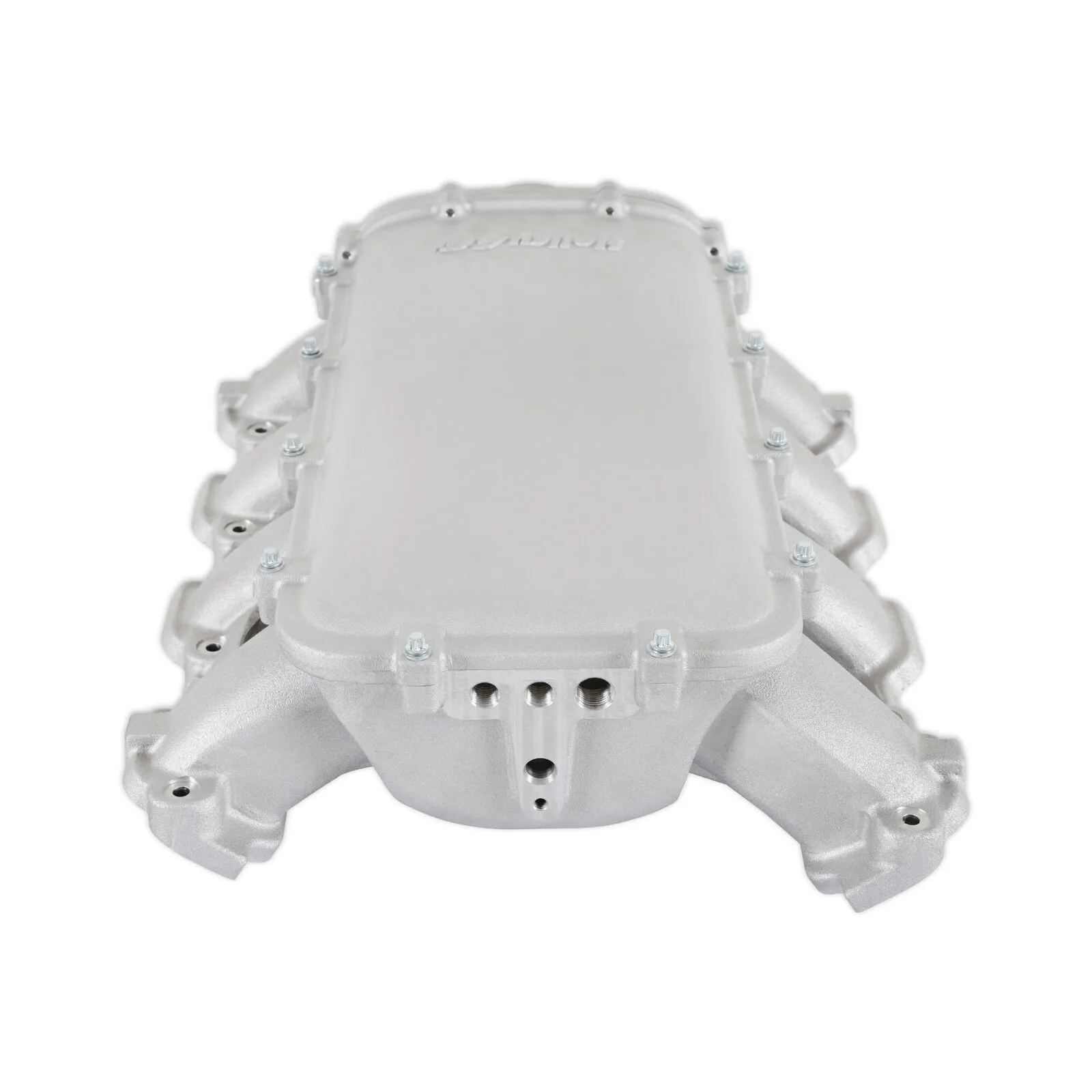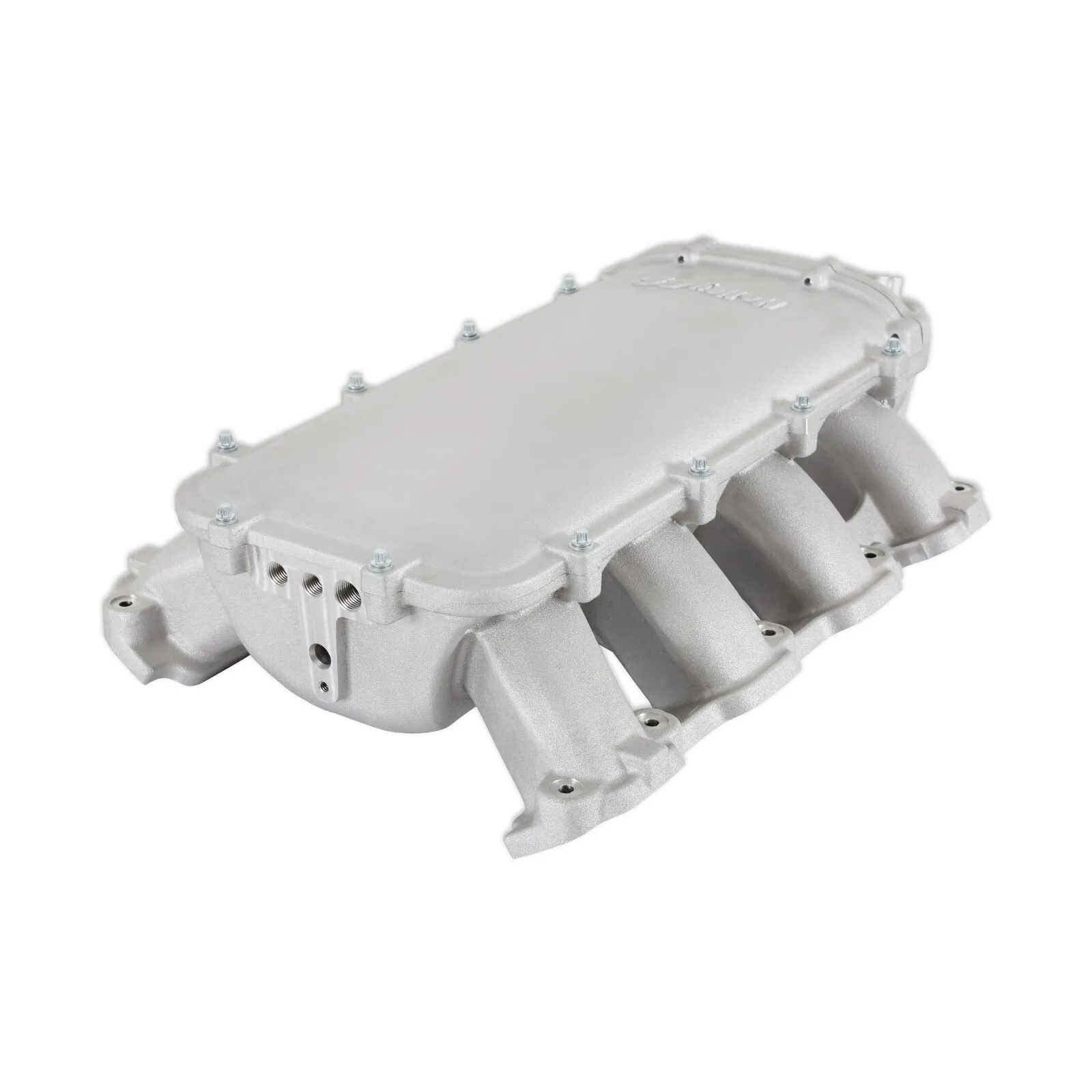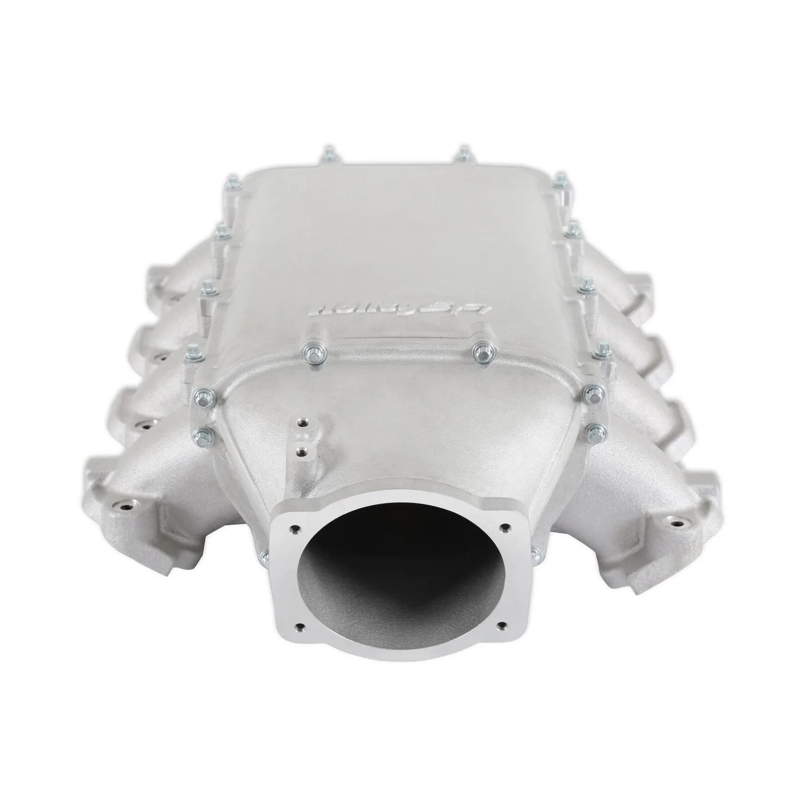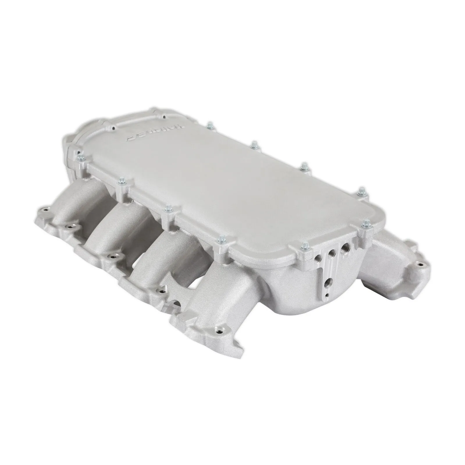 The front entry throttle body flange has a 105mm opening to work with throttle body part number 112-581 or similar models. The front-feed base intake manifold is designed with a lower overall height to fit under a stock or mildly modified hood. The Ultra Lo-Ram provides a very low-profile modular intake manifold along with various fabrication flanges to aid the fabrication of special throttle body adapters or inlet ducts for custom installations. Available for OE direct fuel injection only and with port fuel injection provisions and a burst panel flange options.
