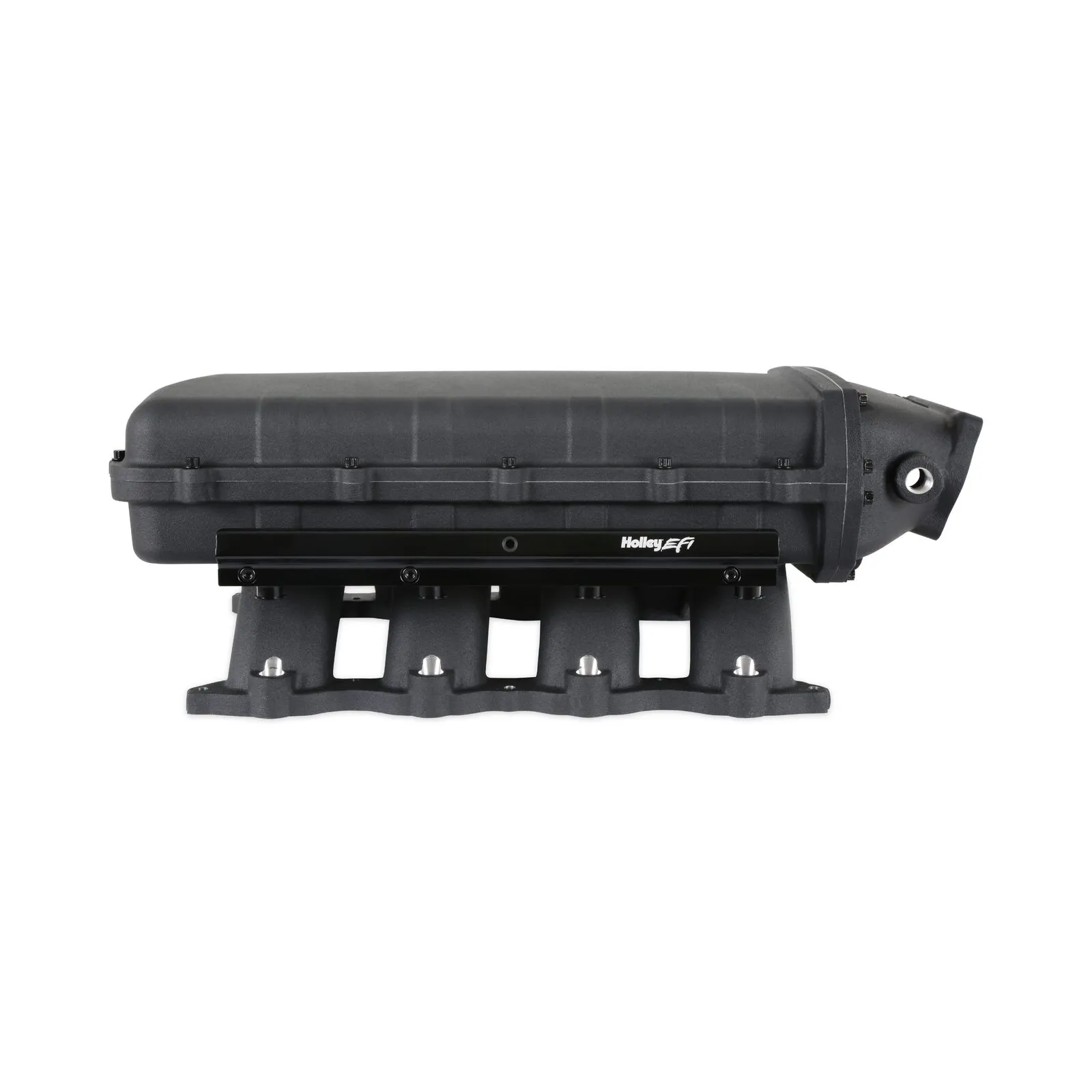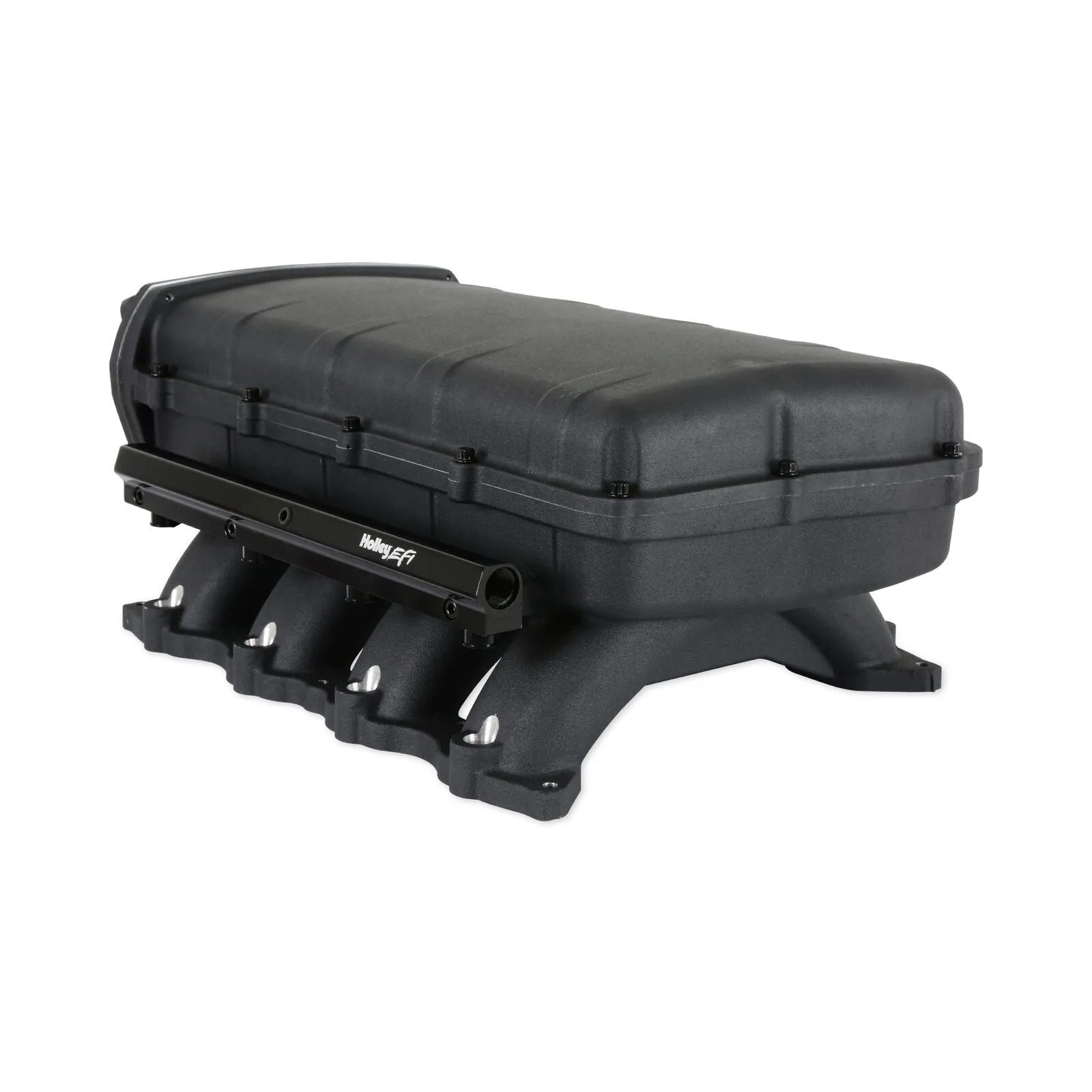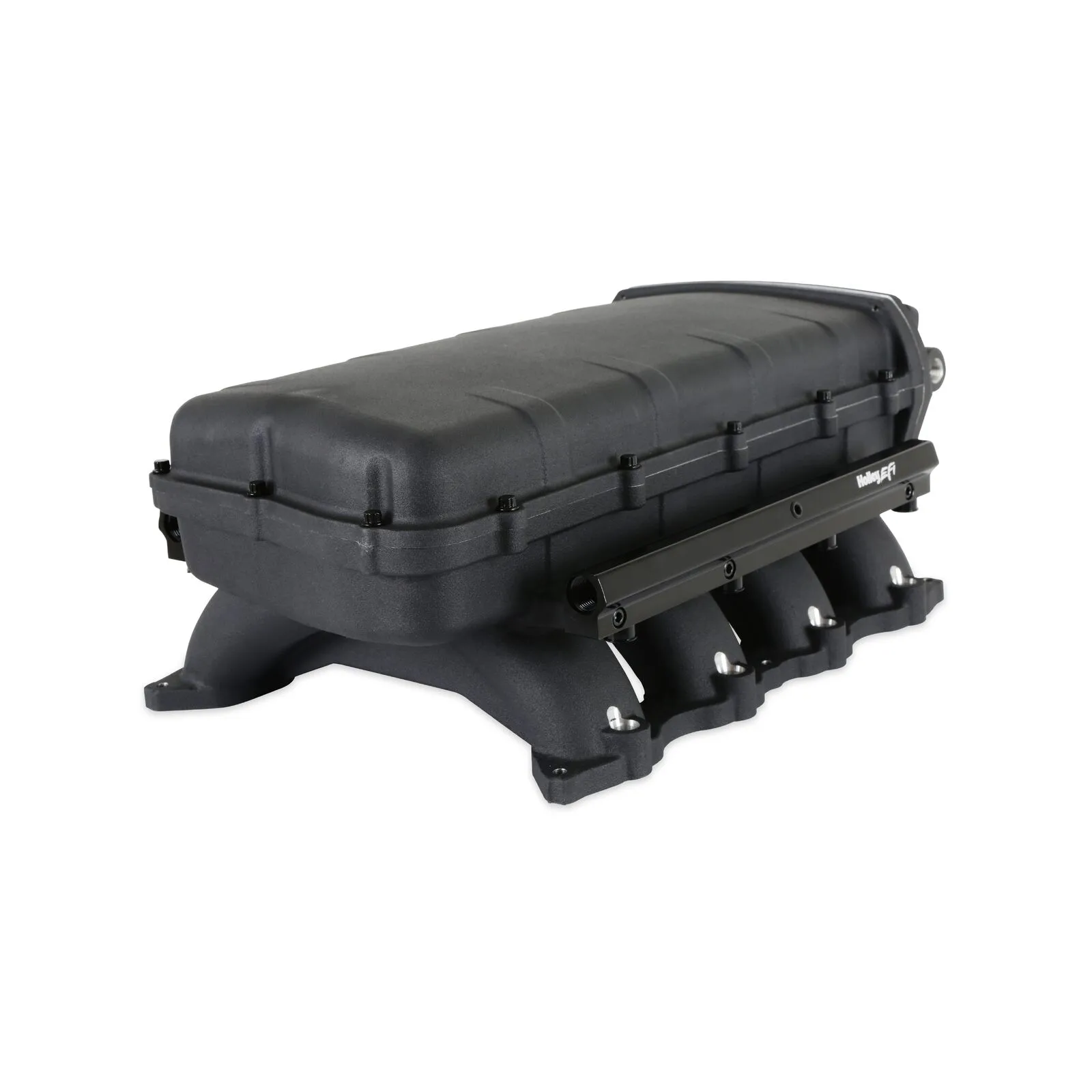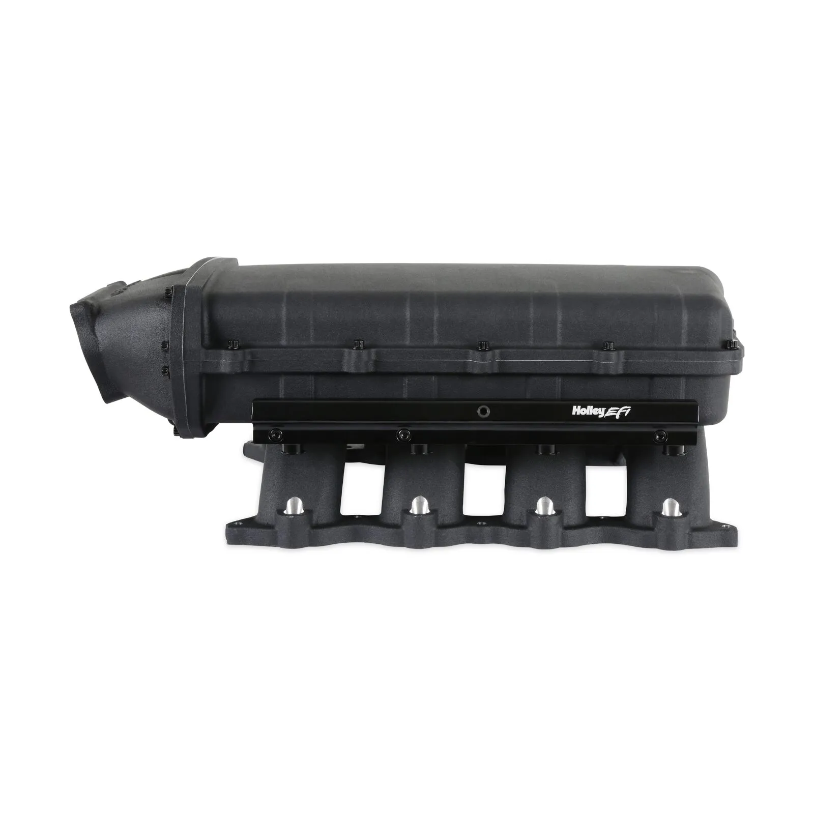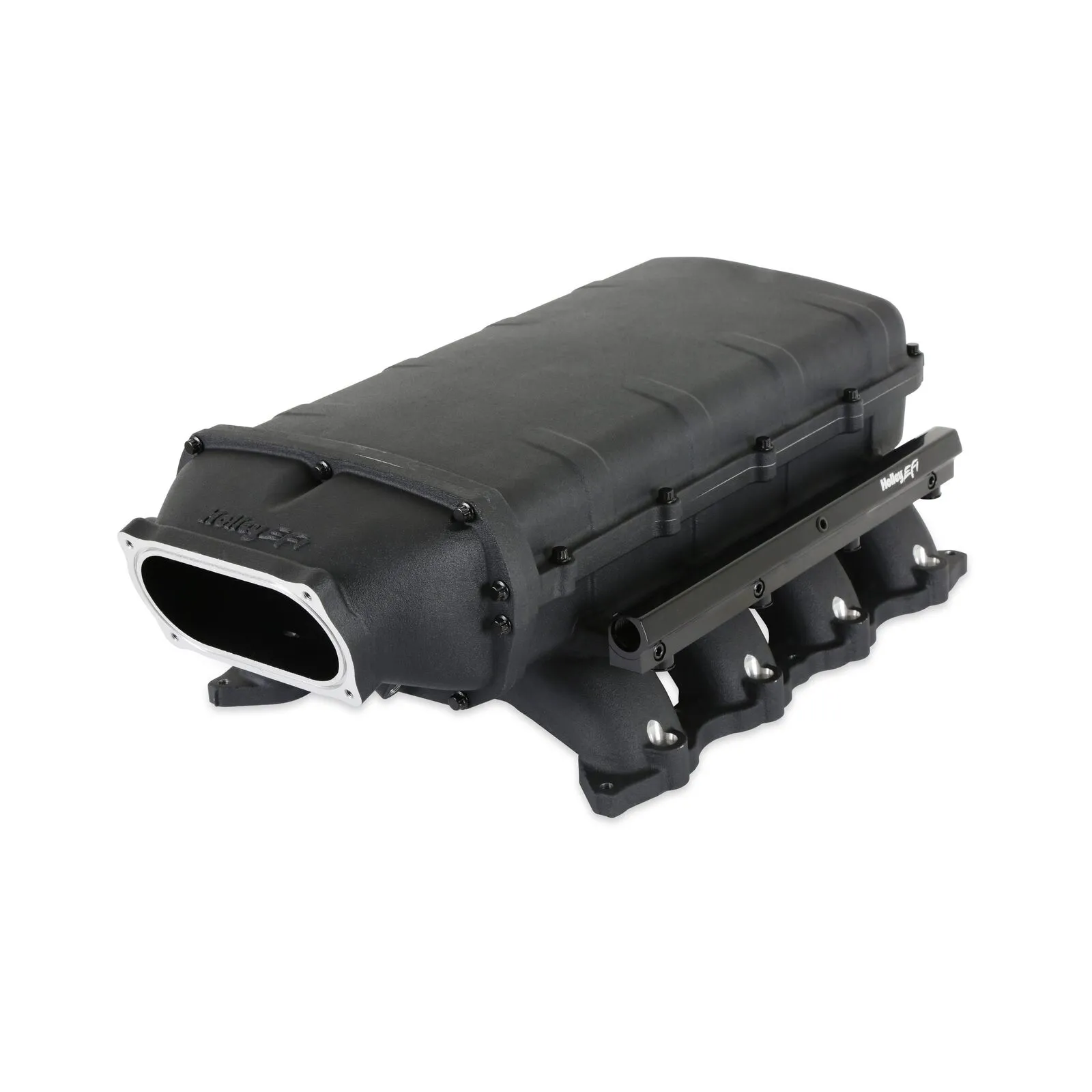 The aggressively designed Hi-Ram is constructed in a two-piece design to accommodate for air to water intercoolers and feature up to 20% more plenum volume versus Ultra Lo Rams. This manifold design is only offered in an oval throttle body configuration.