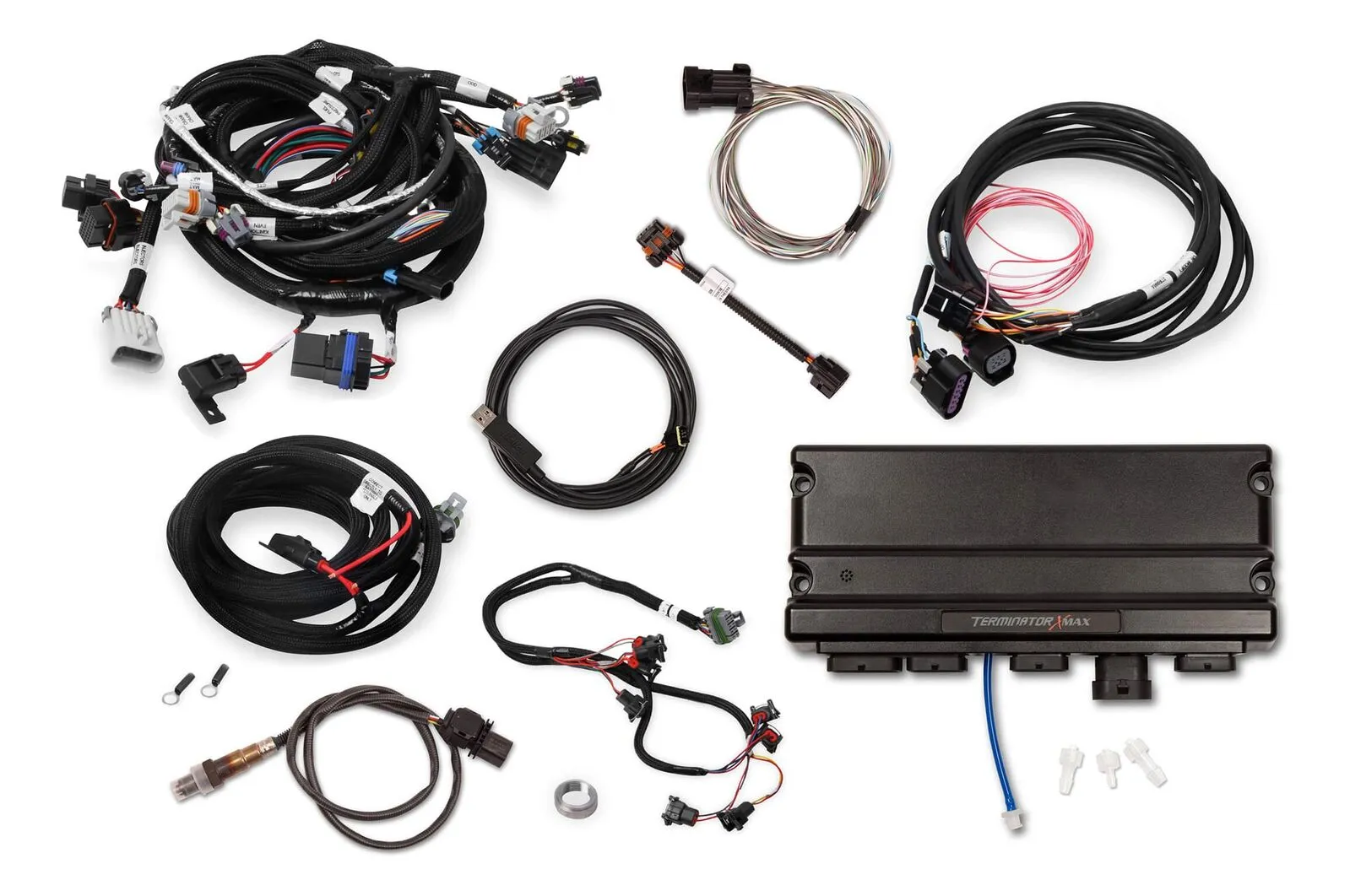 - Includes: 58x/4x LS Engine Main Harness - EV1 Injector Harness - DBW Throttle Body Harness - Terminator X MAX ECU - ECU Main Power Harness - Bosch LSU 4.9 Wideband Oxygen Sensor - Input/Output Harness - and assorted vacuum adapters.