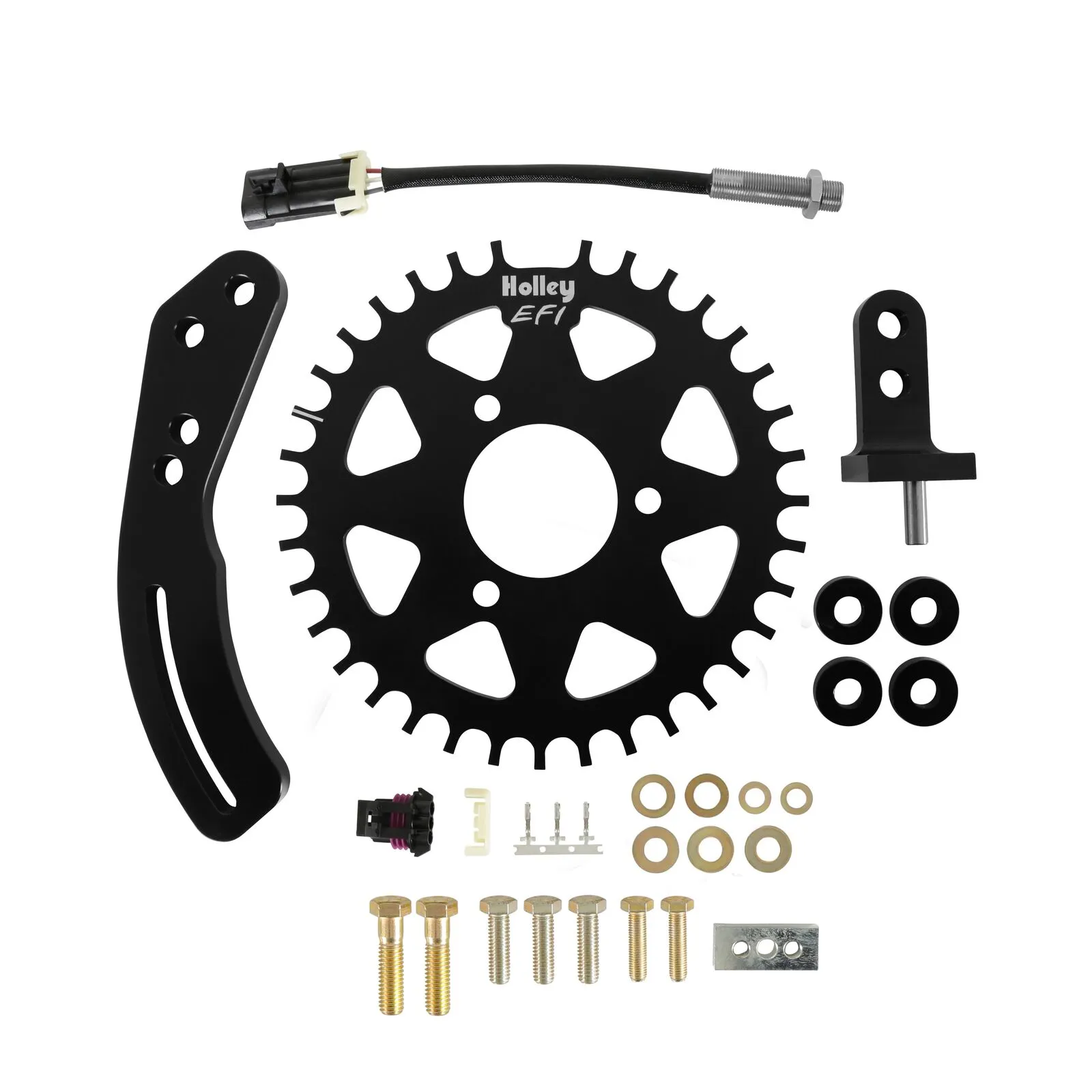 • All billet, 6061-T6 aluminum sensor mounting brackets with “bright-dipped” black anodized finish & Laser etched Holley EFI logo