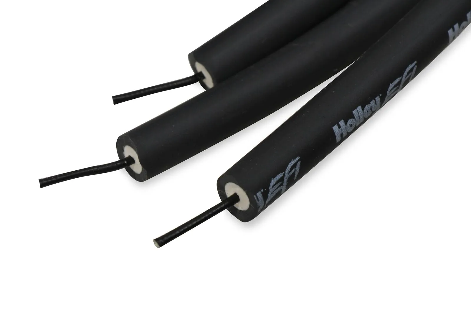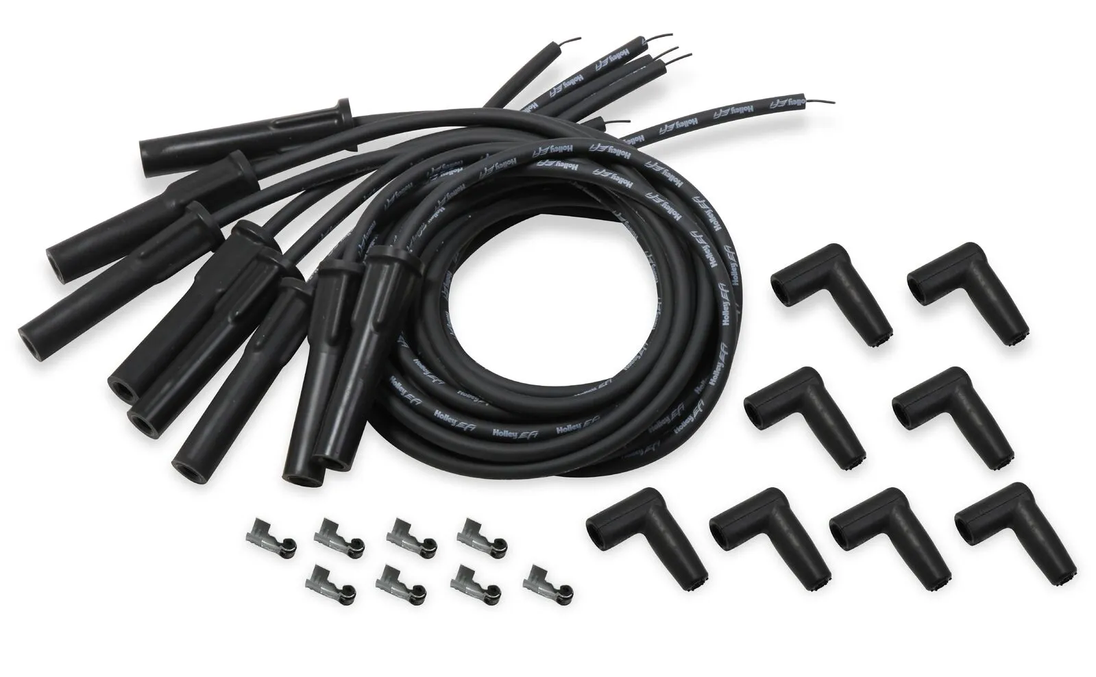 Holley EFI Universal "Cut-to-Fit" spark plug wire sets for GM Ls Engines come with the spark plug terminal and boot installed with the Coil end unterminated. Coil cap boots and terminals are included so you can cut the wire to the desired length, then install the terminal.