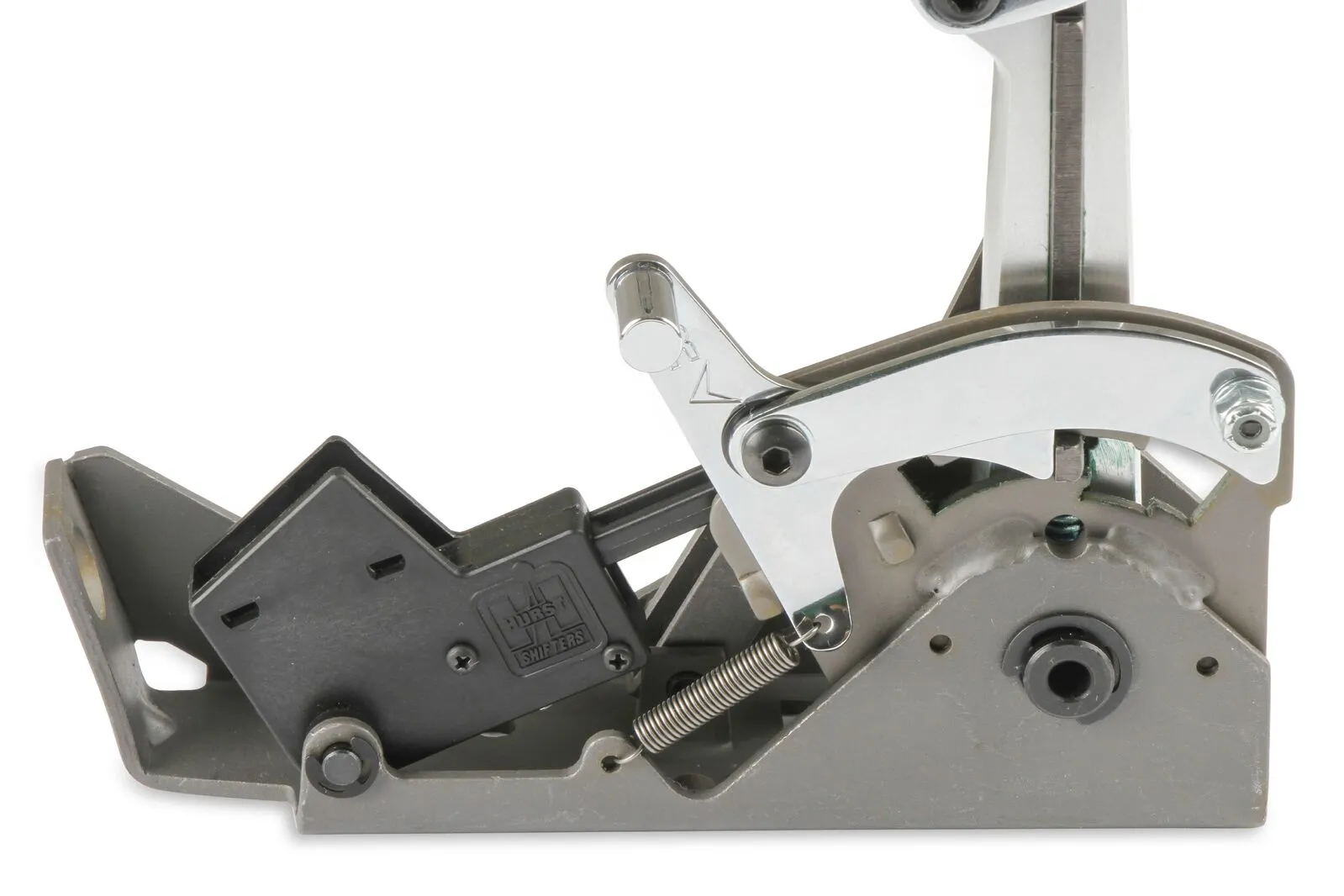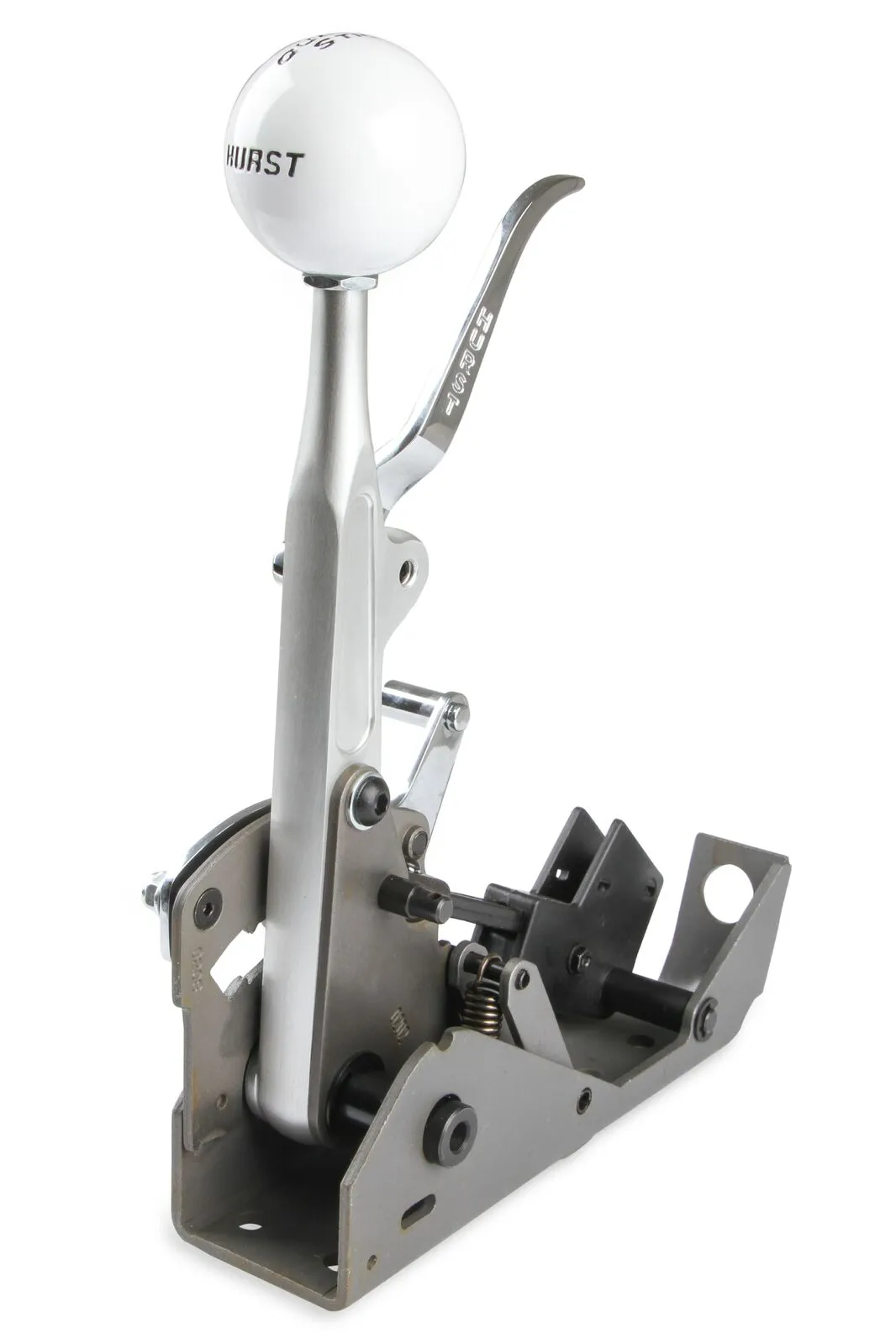 The Hurst® Quarter Stick® shifter provides positive gear change control for both street and race applications. Its compact size fits easily in race cars with limited space and is very lightweight at only 2.5 pounds. Features include black oxide coated steel construction, 1018 hardened steel gate plate, forged aluminum shift stick with 7/16-20 tpi and a classic white Hurst® shift knob. Other features include factory installed neutral safety switch, chrome-plated trigger, and a spring-loaded reverse Loc/Out mechanism that complies with NHRA/IHRA safety rules. Includes all necessary hardware, a 5-foot long shifter cable, and complete installation instructions. Note: Optional aluminum mounting bracket, backup light switch and lightweight aluminum or plastic shifter covers available separately.
