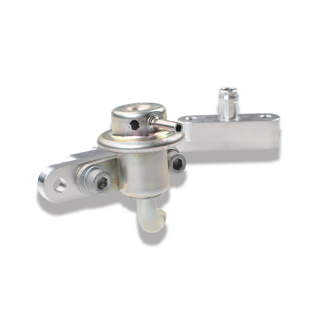 The IAG Performance Fuel Pressure Regulator (FPR) adapter is designed to allow the stock FPR to be remote mounted. This is common when performing upgrades such as larger injectors, fuel rails and fuel lines and is a standard feature when purchasing the IAG billet fuel rails. This adapter retains the stock fuel line outlet and converts the o-ring inlet to a 3/8 inch OD hose barb. It also features a 1/4 inch hole to allow universal mounting in the engine bay with a single 6mm bolt. The FPR adapter is engineered and manufactured in our own facility in Westminster, Maryland. It is machined from a single piece of 6061 aluminum and includes the zinc coated steel hardware.