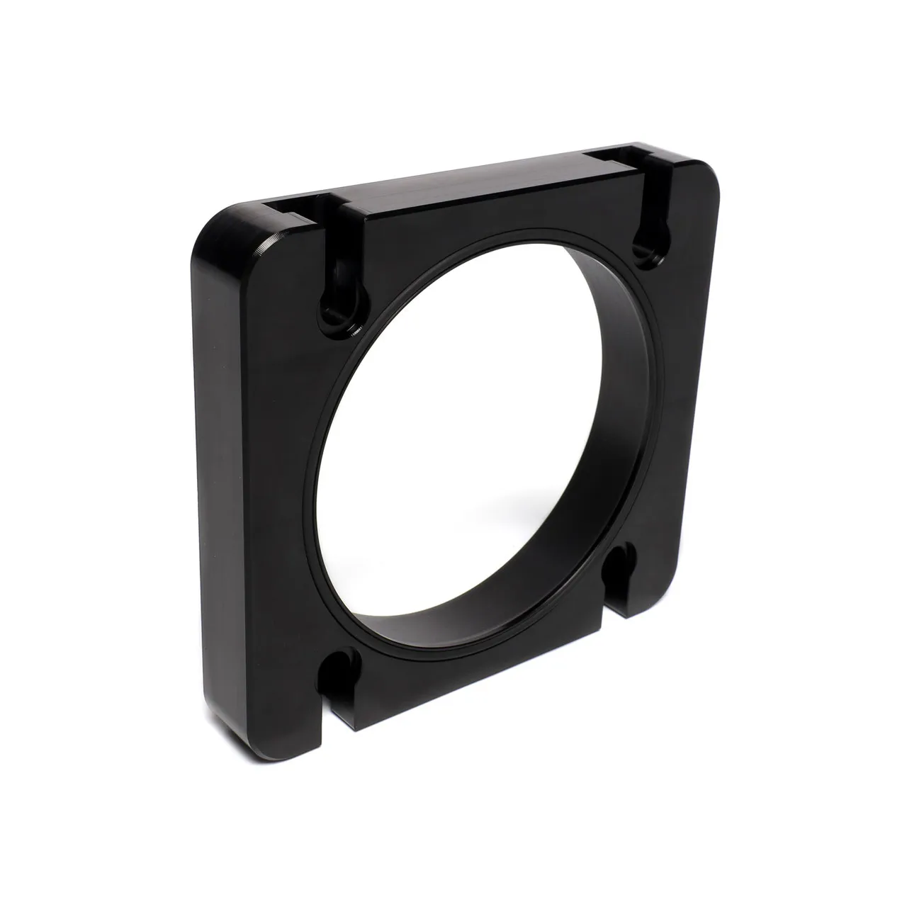 In the hunt for more than 600 horsepower Subaru owners can be limited by their OEM throttle body. The OEM units just aren't big enough to meet the demands of larger upgraded turbochargers. For years those who were seeking to upgrade this component were forced to use inferior aftermarket alternatives. These aftermarket throttle bodies were prone to issues like sticking, poor idle quality, and difficult installation. IAG is pleased to announce that these owners are no longer forced to compromise drivability for horsepower. With the introduction of our new adapter plates owners are able to upgrade their OEM throttle bodies with a larger OEM quality unit. The Big Bore throttle body offers a 76mm bore which nearly 25% larger over stock. Best of all, the installation is much easier than other options previously available. Simply remove the OEM Subaru throttle body, install the supplied adapter and new 76mm Throttle body to the intake manifold. No complicated disassembly, no springs, and the OEM connector is plug and play. The plates are machined from 6061 aluminum, and feature an O-ring sealing surface. Each package includes a brand new Big Bore 76mm Throttle Body, IAG adapter plate, and all the necessary hardware to complete the installation. The adapter plates are available in anodized black finish.