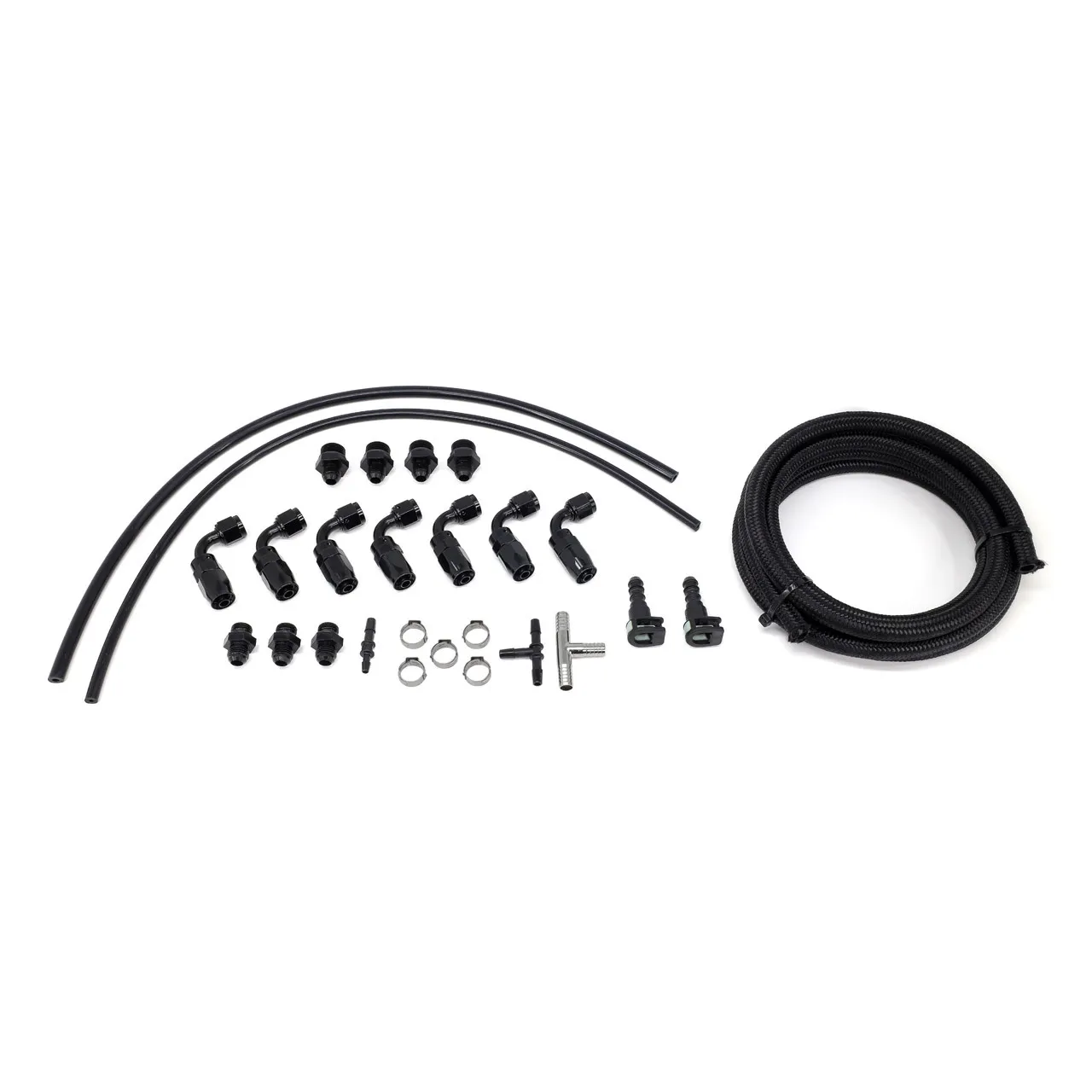The IAG Performance Fuel Line kit is designed to work with the IAG Top Feed Fuel Rails and and aftermarket -6 Aeromotive FPR (Fuel Pressure Regulator). These braided lines are larger in diameter for increased fuel flow. They include all clamps and fittings to mount to IAG Top Feed Fuel Rails. IAG Recommends installing these lines in a parallel configuration for optimal fuel flow to all cylinders.