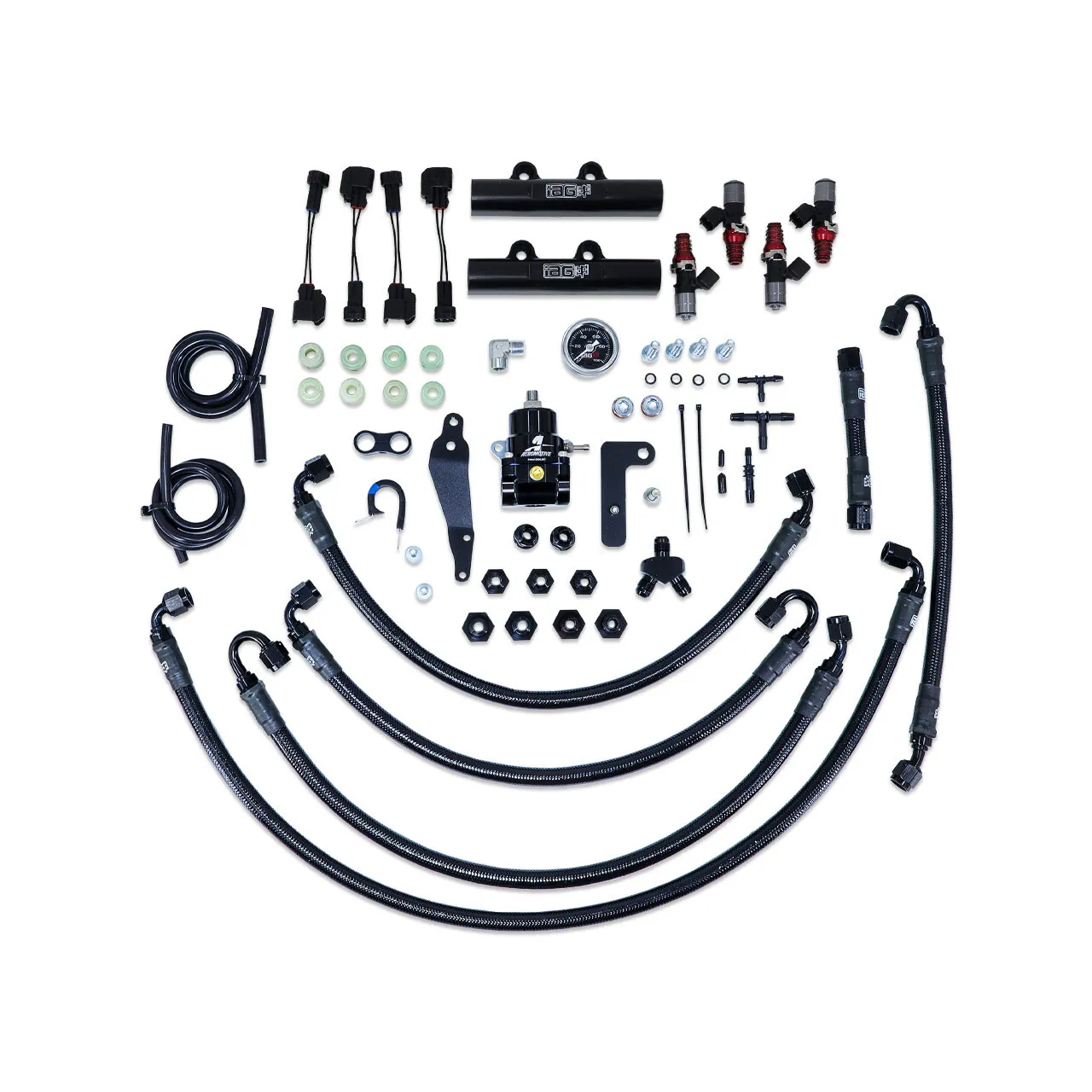 The IAG Fuel System kits provide everything you need to successfully feed your engine with enough fuel to meet your horsepower demands. Made in the USA and constructed of chemical resistant PTFE, these line kits are easy to install and don't require any cutting or hose assembly. Each line kit is compatible with modern ethanol fuels, including E85. These kits include IAG Fuel Rails and the IAG Adjustable Fuel Regulator, for precise control of your fuel pressure. Tested to over 1000 horsepower, these attractive fuel rails are available in Black to match your engine bay. Compatible with most aftermarket top-feed injectors, these rails are easy to install with the included fittings and lines.