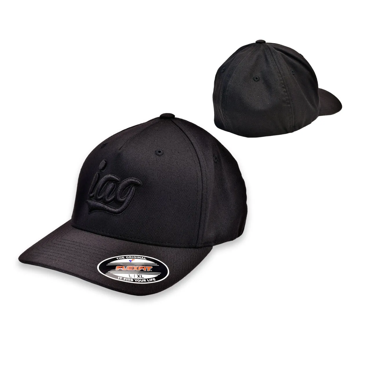The IAG black Flexfit cap features a raised script IAG Logo embroidered on the front.
