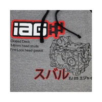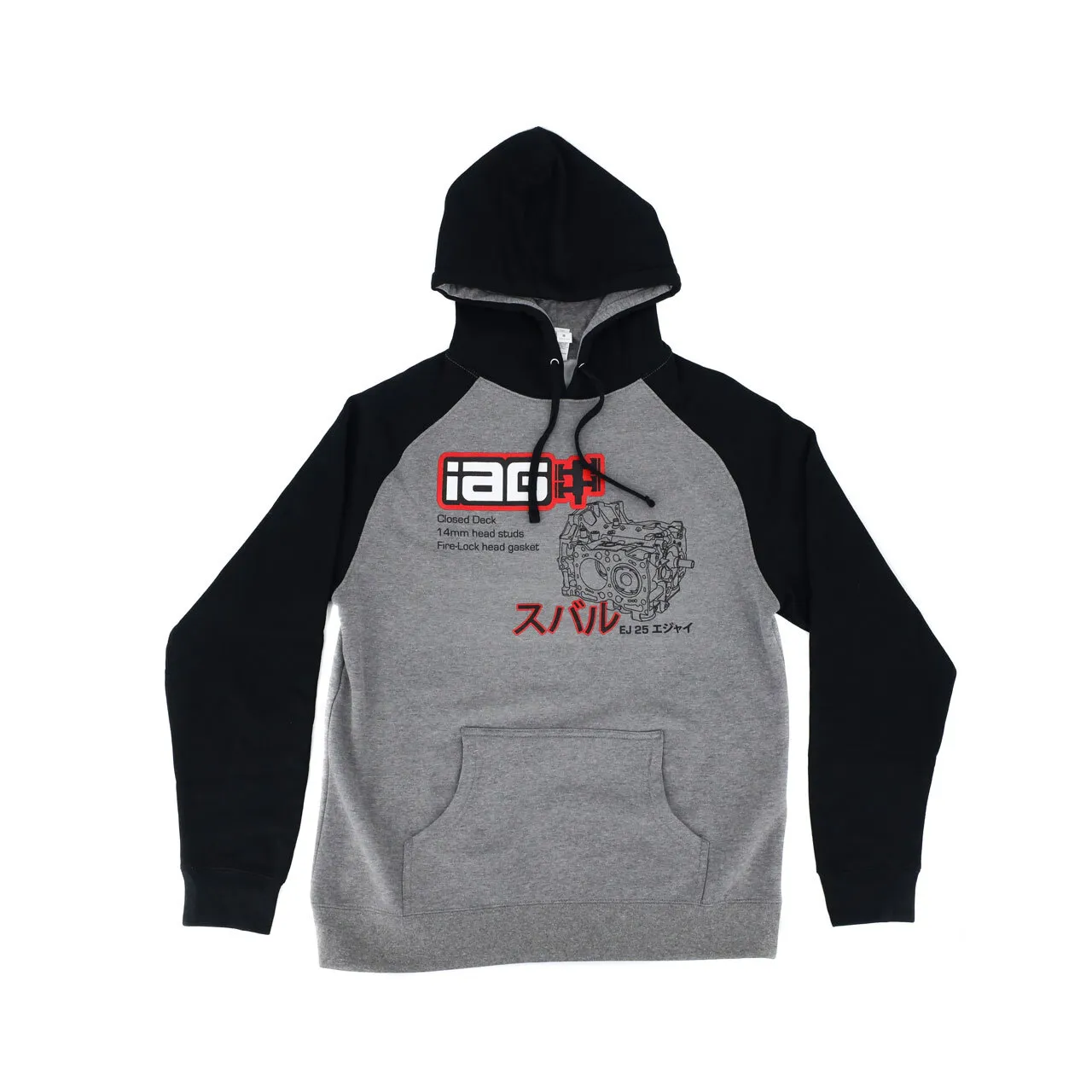 The IAG Men's Closed Deck Hoodie features IAG Performance's boxer logo and closed deck graphic on the front of the sweatshirt. The 3 color graphic is printed on a hooded pullover sweatshirt that is 55% Cotton / 45% Polyester featuring black raglan sleeves with gray chest and back.