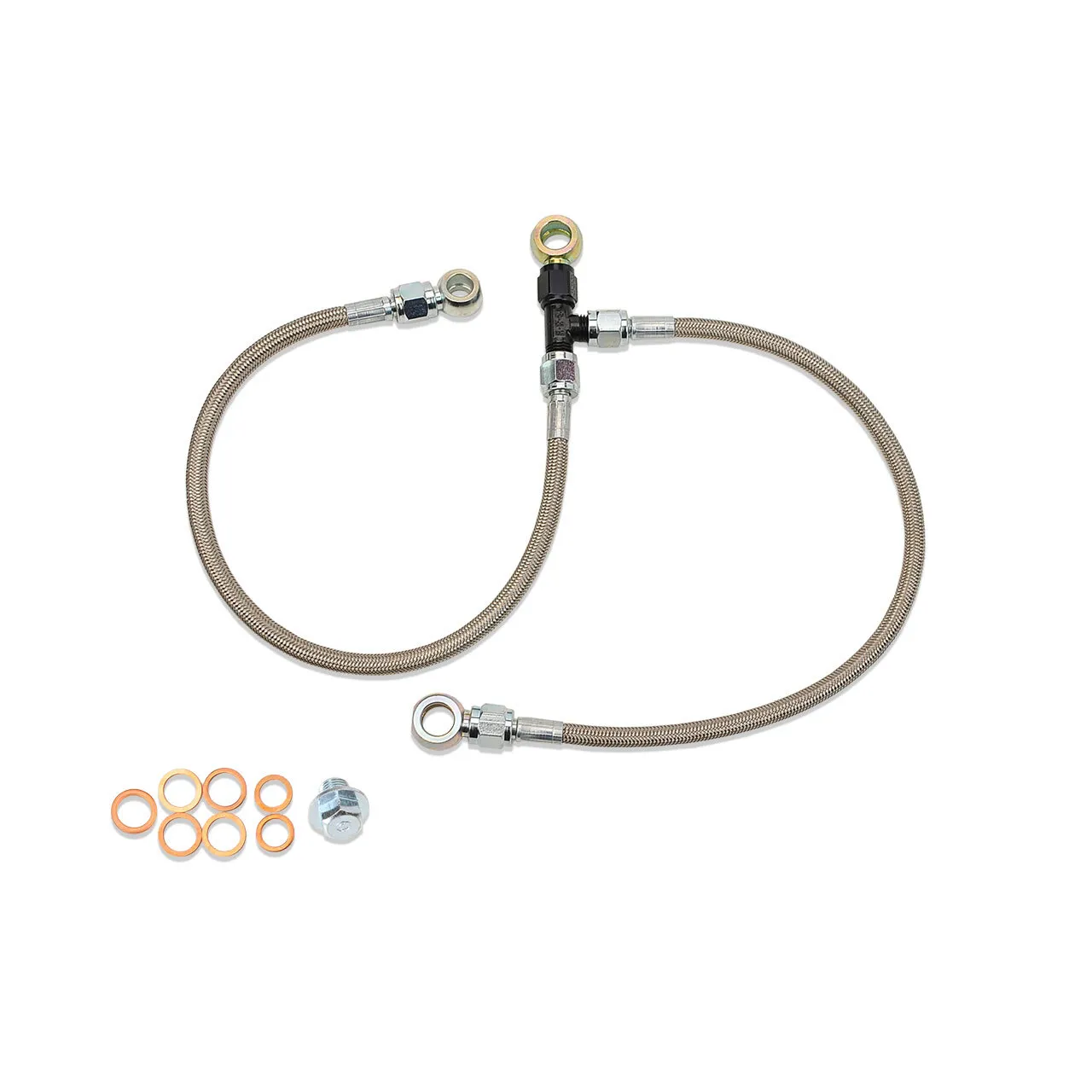 The OEM Subaru turbo oil feed line is a known weak point that can be easily damaged when removing or installing a turbo. IAG’s Stock Location Turbo Oil Feed & AVCS Line kit features a superior design that not only eliminates the problems associated with the factory oil feed lines, but increases the oil flow to your Subaru’s engine and turbocharger. Our Oil Feed & AVCS Lines are constructed from braided stainless steel that can be flexed without the worry of cracking. They are capped with stainless -4AN fittings and feature a teflon coated inner lining that is able to stand up to high temperature environments. The included banjo fittings are made from high quality steel and coated in zinc for corrosion resistance. We also offer replacement OEM Banjo bolts to replace existing worn or clogged hardware. Part# IAG-ENG-2070 is the standard kit that is used on the majority of stock location turbo cars. It uses a 10mm banjo fitting that bolts to the turbo oil feed port. This kit will work with any non-ball bearing turbo that utilizes a 10mm banjo style oil feed. If your application requires a different oil feed fitting, you can simply unscrew the banjo and you will have a female -4 AN to which you can connect the fitting of your choice.