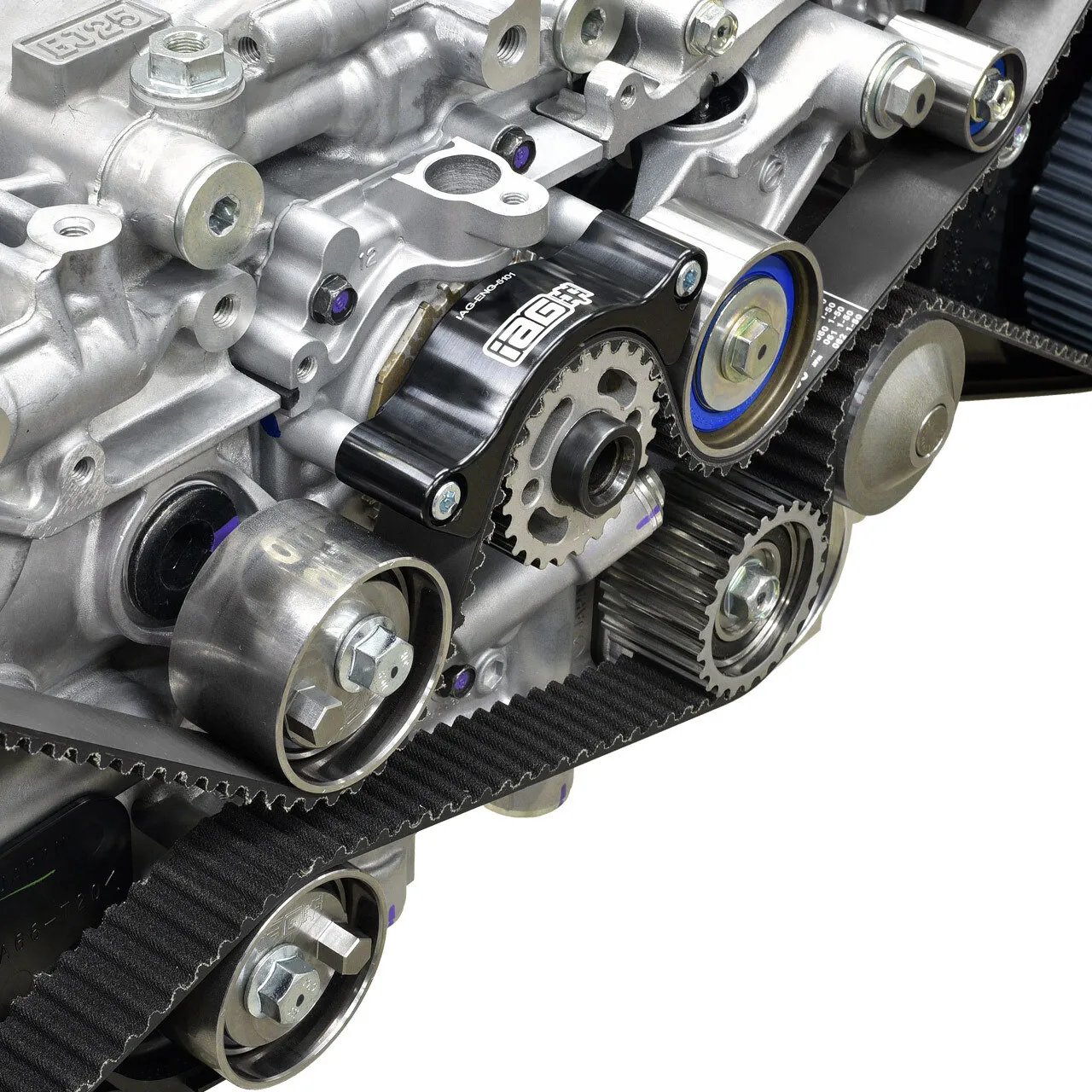 The IAG Timing Belt Kit is designed as a replacement for the OEM EJ20 and EJ25 engines. Included in the kit are IAG Adjustable Idler Pulleys, IAG's black racing timing belt, IAG timing belt guide, OEM idler, and timing belt tensioner. The IAG Adjustable Timing Idler kit is intended to properly align the camshafts on Subaru EJ20/EJ25 cylinder heads and/or blocks that were resurfaced (“Reducing” long block length), or utilize thicker head gaskets (“Increasing” long block length). The product is precision CNC machined and hand-assembled in-house. Each idler features a machined 10mm hex enabling your socket to hold it in place while you adjust the timing to perfection. The IAG Black Racing Timing Belt works with all Subaru EJ series engines. The belts are lightweight and utilize EPDM Rubber for increased durability and performance in all climates. The Kevlar construction is 300% stronger than the OEM belt and is also three times more heat resistant. The teeth are made of H-NBR grade rubber for additional strength. Extensive testing of this belt on our Spintron testing machine, as well as our fleet of racing vehicles, found that these belts ensure accurate timing and unmatched performance. The timing belt tensioner is one of the most important components in the Subaru timing system. Aftermarket, units are known to fail prematurely, which can cause catastrophic failure. The IAG Timing Belt Kit includes an OEM original equipment tensioner assembly direct from Fuji Heavy Industries. In Subarus, it is more common to experience a timing idler-bearing failure than it is to experience a failure of the timing belt itself. The IAG timing belt guide is the best method to prevent your EJ engine from skipping a beat. Each guide is machined from a single piece of 6061 billet aluminum and then anodized black for a protective finish. The guide is a strong, rigid replacement and adjustable to set the proper clearance for the timing belt.