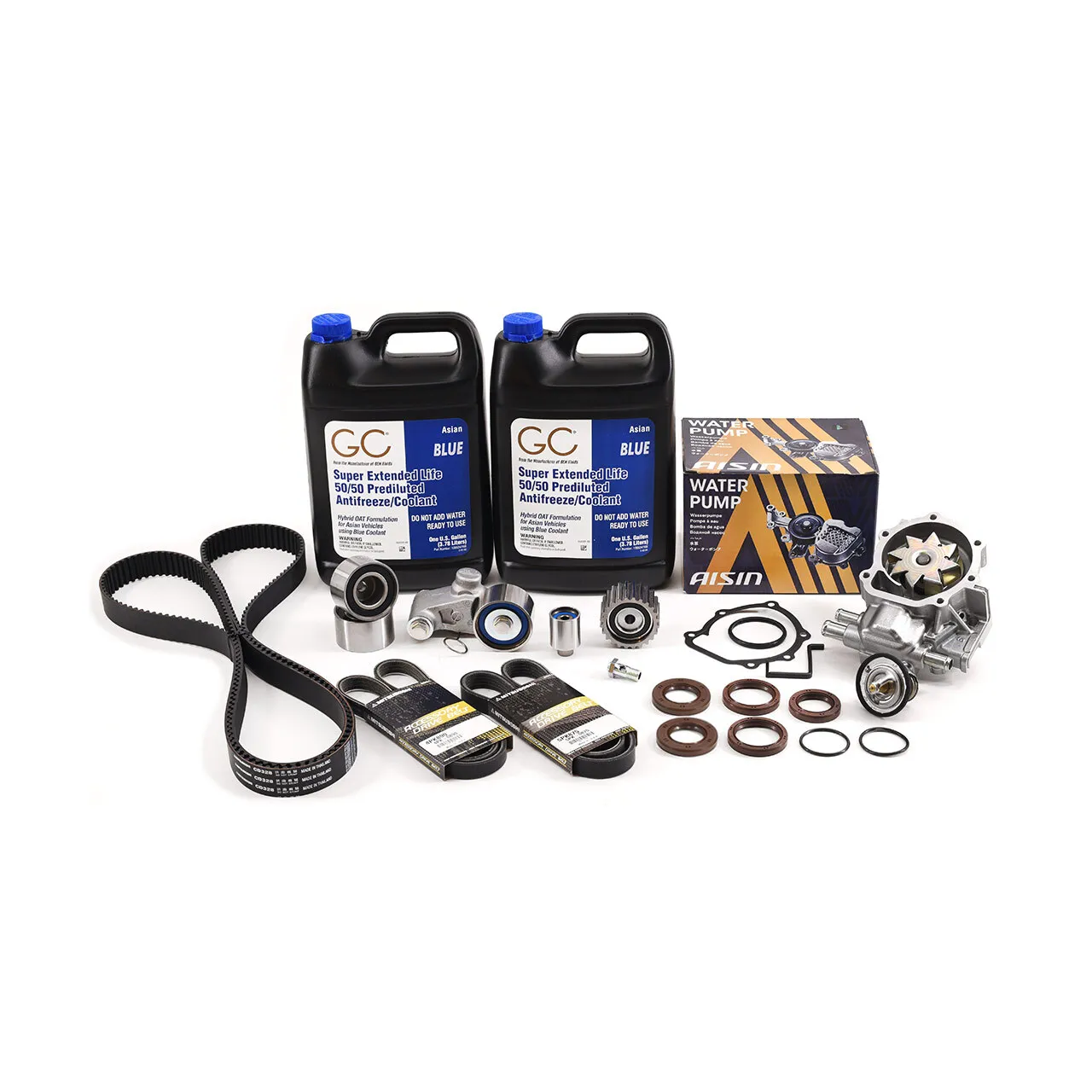 The IAG 105k Service Package includes an AISIN Water Pump and provides all the timing-related parts required for your 2006-2007 Subaru WRX's 105k service. This comprehensive package comes with the timing belt, tensioner, power steering/alternator belt, A/C belt, idlers, gear idler, thermostat, and AISIN water pump. It also includes the crankshaft seal, camshaft seals, O-rings for the AVCS intake sprocket plates, and a replacement AVCS oil feed line filtered fitting. Subarus are known for their reliability and resilience, and even with 105,000 miles, your Subaru has plenty of miles to go! Subaru suggests a 105,000-mile service to keep your engine in top running condition. This service includes the timing belt, thermostat, accessory belts, idlers, and water pump. Within our 105k Service Package, you'll find everything necessary for your service, including the crankshaft seal, camshaft seals, AVCS intake sprocket plate O-rings, and a new AVCS oil feed line filtered fitting. This fitting becomes easily accessible after the timing components are removed, providing a perfect opportunity for inspection and replacement. IAG's 105k Service Package gives you the flexibility to replace all the recommended maintenance components as well as these commonly worn parts in a single service, saving you both time and money.