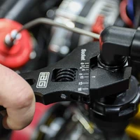 The IAG Aluminum Adjustable Wrench AN Wrench is 8 wrenches in 1. Now you can work with 3AN, 4AN, 6AN, 8AN, 10AN, 12AN, 14AN and 16AN fittings all from one wrench. The specially formed jaws are able to contact a fitting on four opposite sides to avoid stripping and or marring an aluminum fitting's finish. Made from 6061-T6 aluminum and anodized black, the wrench features an ergonomic grip that improves comfort and reduces the chance of your hand slipping during use. The adjustable wrench also has an easy to read laser engraved size chart located at the jaws and a smooth operating thumb screw that quickly moves the jaws to the desired position. The IAG Aluminum Adjustable Wrench AN Wrench is the perfect tool for working with aluminum AN fittings found in many automotive racing fuel and oil component systems.