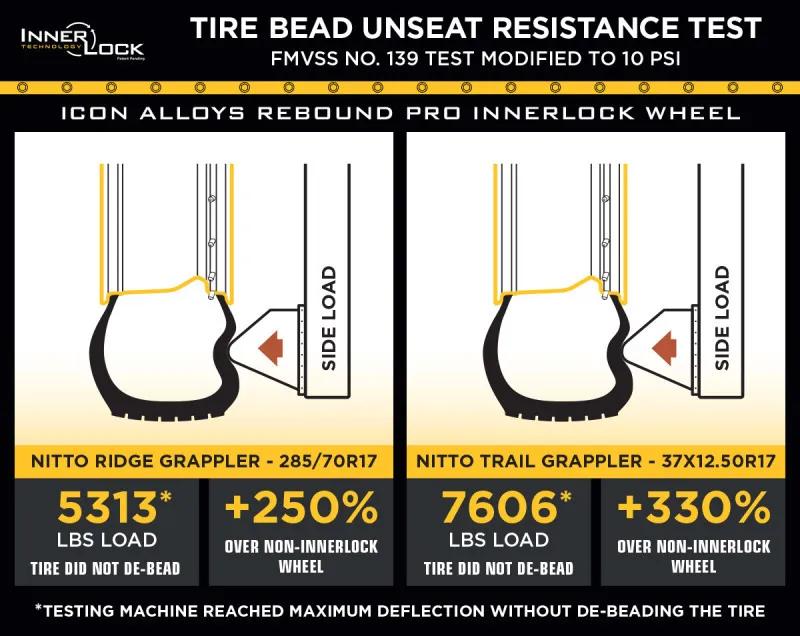 Staying true to the ICON Alloys approach, the Rebound PRO has been engineered to maximize caliper clearance and optimize wheel position for un-hindered suspension travel and steering function. Backspace and wheel offset dimensions have been strategically developed to reduce scrub radius, improving all-around handling and ride quality. The Rebound PRO has also been strength tested to yield a 3,200lb load rating - making it one of the strongest wheel options on the market. With build features such as these, it's clear that a set of ICON Alloys wheels is the perfect complement to any truck, Jeep, or SUV.