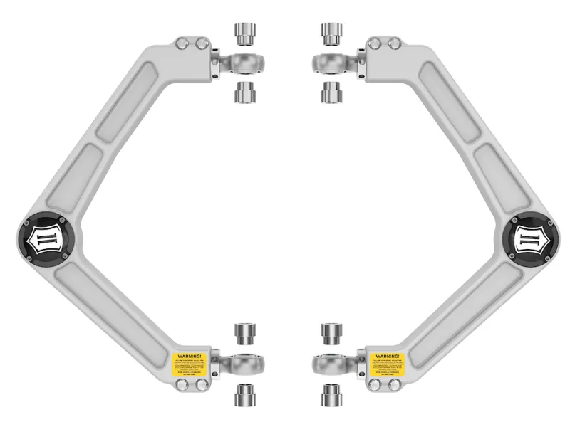 These upper control arms feature ICON's patented Delta Joint. The Delta Joint is a heavy-duty high angle ball joint that combines the durability of a ball joint with the performance characteristics of a traditional uniball. While the industry standard uniball does a great job of allowing the control arms of a vehicle to articulate with little bind, they do have an inherent weakness that leaves more to be desired when used in a daily driven application - exposure to the elements. The Delta Joint features a zinc plated housing providing the first layer of corrosion resistance, while a tough grease seal keeps potentially harmful elements out of the inner workings of the joint. Metal on metal construction and a greaseable design increase the longevity of the Delta Joint while at the same time allowing for noise-free operation. What makes the Delta Joint unique is that it brings the best of both worlds to ICON upper control arms with features that make it more robust than a uniball, and at the same time capable of greater angularity than a typical ball joint.