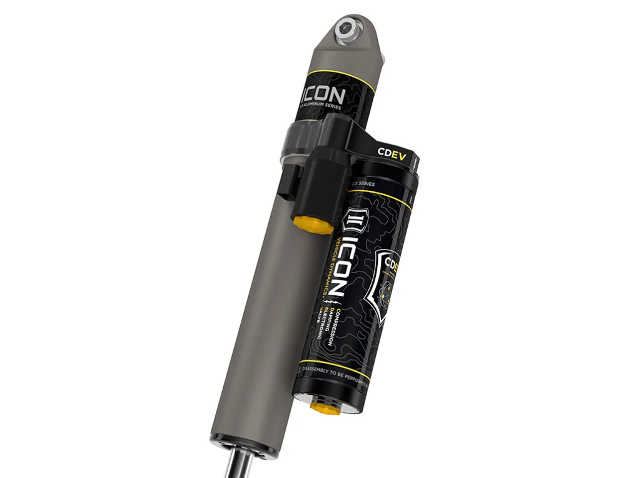 Compression Damping Electronic Valve (CDEV) is an electronically controlled valve that meters the flow of oil to regulate the amount of damping force that is created by the shock when compressed. This infinitely variable valve can react in less than 40ms and has the ability to make extremely precise adjustments for varying terrain. CDEVs hydraulic circuits are also custom tailored per application to create the highest resolution and dynamic range allowable for each specific vehicle. Powered by ICON Intelligent Control and proprietary ICON mobile app, the system uses information from the onboard G-force sensor and Gyroscope to perform calculations based on algorithms and user-defined settings to predict terrain and adjust shock settings via the CDEV accordingly.