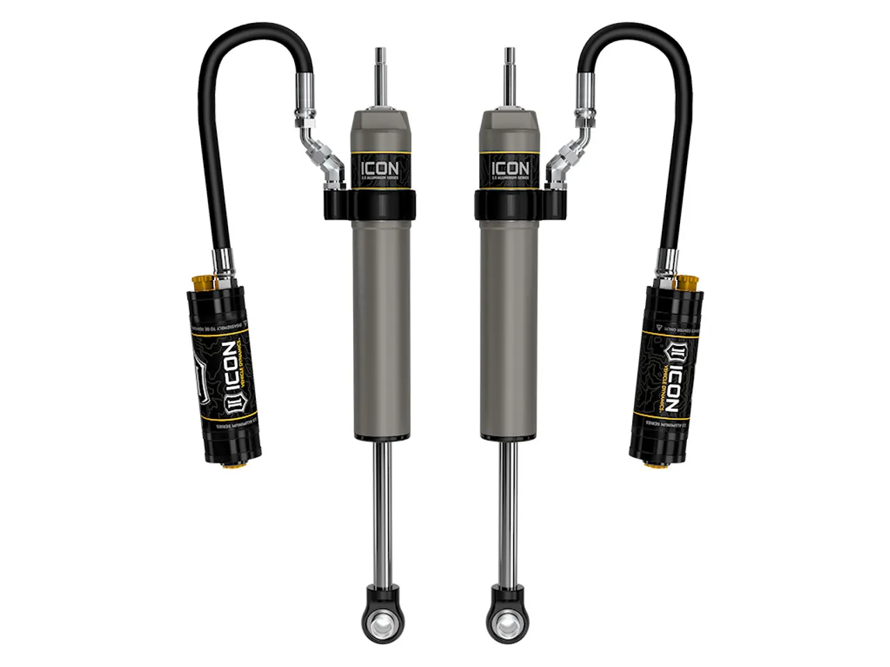 ICON Vehicle Specific (V.S.) 2.5 Aluminum Series CDCV shocks are designed and built to give your vehicle outstanding performance off-road and a smooth ride on the street. These shocks are configured specifically for each application in both length and damping tune. Like all ICON'S Shock Absorbers, V.S. 2.5 Aluminum Series shocks are 100% rebuildable and 100% revalveable. For piggyback and specific remote reservoir applications, ICON'S unique use of a 6061 billet aluminum manifold a few inches below the top cap of the shock creates an internal Bump Zone that when used creates an additional 20% of damping force. This additional force helps prevent harsh bottom outs and controls the suspension when compressing at high velocity. The ICON CDC Valve is an externally adjustable valve that restricts oil flow into the reservoir which creates 10 levels of compression damping force ranges.